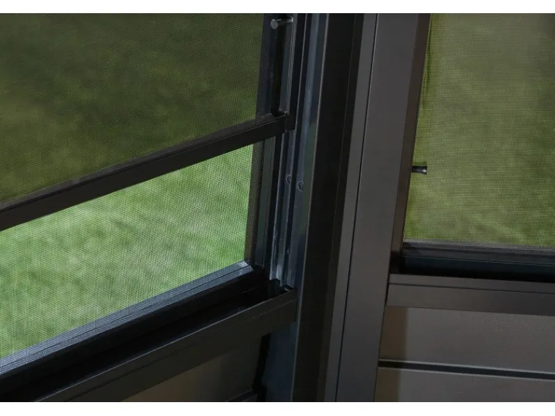 Kontrollierbare Durchlüftung durch 10 Fenster (eins in jedem Wandelement – 94×74 cm BxH) bestehend ausje einem Moskitonetz sowie einem reißfesten PVC-Folien-Fenster, welches zur Durchlüftung einfach nach unten geschoben und mit zwei Handgriffen zum Reinigen herausgenommen wird.