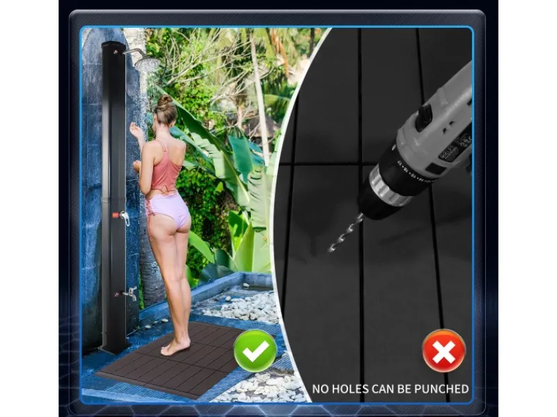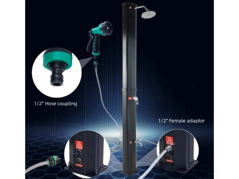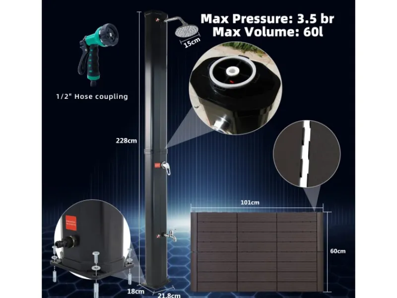 Egal ob Sie einen Swimmingpool besitzen oder einfach nur im Garten duschen möchten – die CCLIFE Solardusche ist die perfekte Gartendusche für warme Sommertage. Mit ihrem schlichten schwarzen Design, einem 60-Liter-Wassertank, einem großen Regenduschkopf, einer Kunststoffbodenplatte und einer praktischen Handbrause bietet sie der ganzen Familie erfrischenden Duschkomfort. Die integrierte Temperaturregelung sorgt für angenehm warmes Wasser, während der verstärkte Standfuß für Stabilität und Sicherheit sorgt.