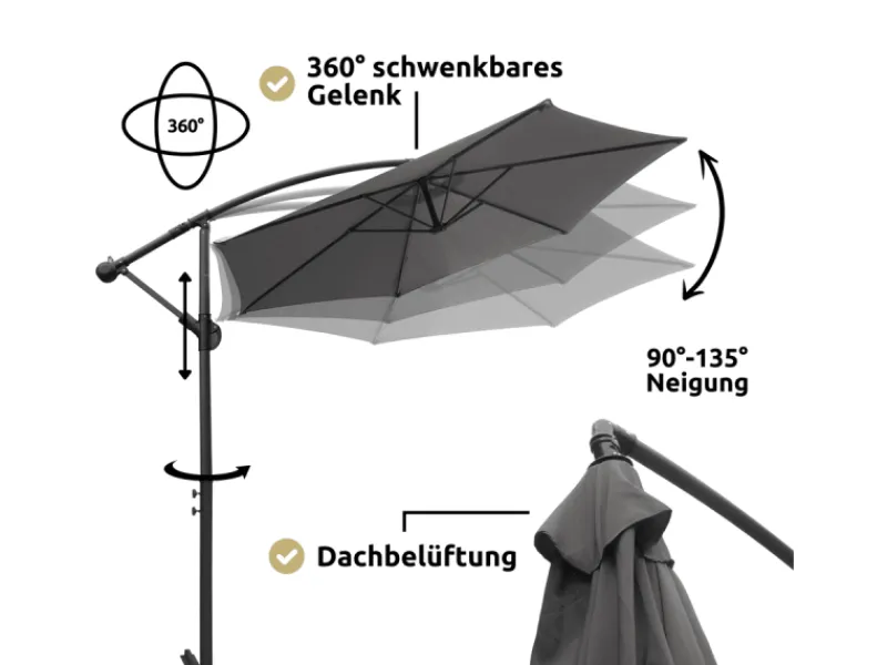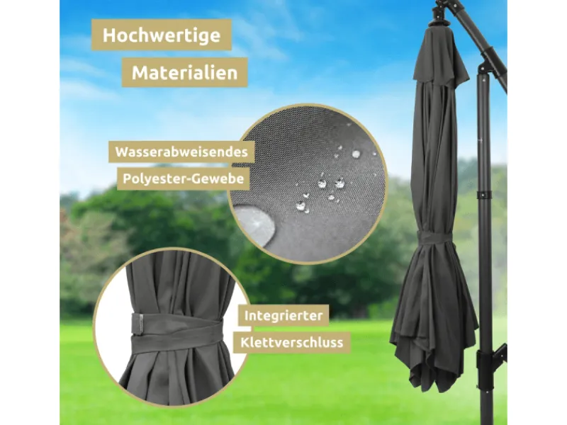 In stylischem Anthrazit oder klassischem Creme passt er perfekt zu jeder Außeneinrichtung. Dank des Ampeldesigns hängt der Schirm elegant über deinem Lieblingsplatz im Garten oder auf der Terrasse.