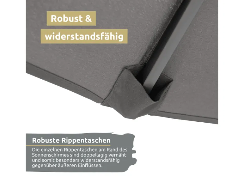 Das robuste 160 g/m² Polyester und die sechs stabilen Stahlrippen sorgen für Langlebigkeit und Stabilität, selbst bei windigem Wetter. Und mit dem inkludierten Cover kannst du ihn problemlos vor Witterungseinflüssen schützen.