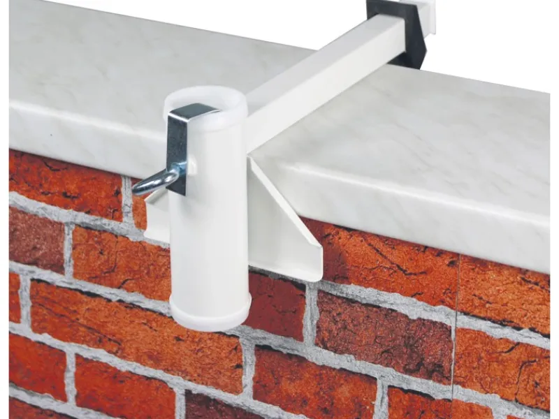 Der hochwertige und stabile Videx Garden Sonnenschirmhalter Typ M für Mauerbrüstung Ø 35 mm Weiß kann – ohne Bohren – an einer Balkonbrüstung bis zu einer Stärke von 24 cm angebracht werden.