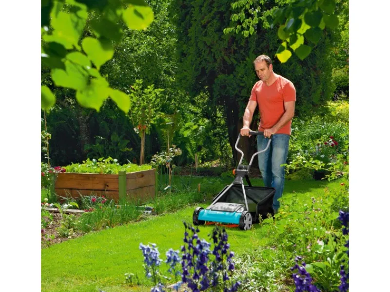 Der Handmäher sorgt mit seiner gehärteten, antihaftbeschichteten Messerwalze aus Qualitätsstahl und einem geschliffenen Untermesser für einen sauberen Präzisionsschnitt. Die berührungslose Schneidetechnologie ermöglicht eine leichtgängige und geräuscharme Anwendung.