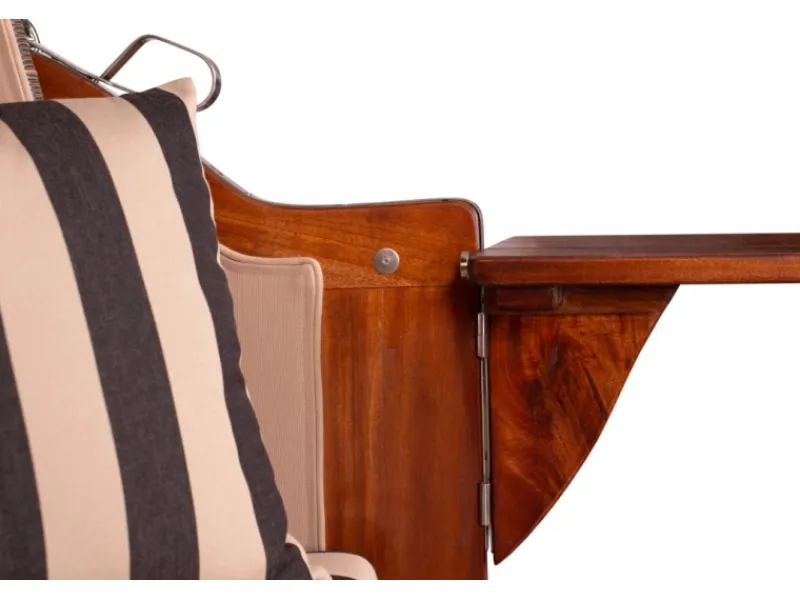 Herrliches Freizeit-Feeling mit dem Strandkorb Nordstrand Mahagoni Es muss ja nicht immer die Ost- oder Nordsee sein- auch in Ihrem eigenen Garten oder auf dem Balkon können Sie in einem unserer Strandkörbe mit Wechselpolster nach Herzenslust die Seele baumeln lassen. Die ausgesprochen exzellente und bis ins kleinste Detail ausgeführte hervorragende Verarbeitung weckt bei diesem Volllieger bereits die Lust, es sich nach der Betriebsamkeit des Alltags in diesem Strandkorb so richtig gemütlich zu machen. Auf Grund der Design- Vielfalt, die wir Ihnen bezüglich der Polsterung präsentieren, haben Sie die Möglichkeit, sich den Strandkorb Nordstrand nach Ihren ganz persönlichen Wünschen zu gestalten. So schaffen Sie sich einen unverwechselbaren und individuellen Rückzugsort mit charakteristischer Optik, der Sie auf hohem Niveau zur Entschleunigung einlädt. Hochwertiges Mahagoniholz Dass für den Strandkorb Nordstrand verwendete Mahagoniholz überzeugt durch seinen edlen, rötlich-braunen Farbton, der dem Strandkorb seinen klassischen und maritimen Charakter verleiht. Zudem sorgt das massive Mahagoniholz für Standfestigkeit und Stabiltität und macht den Strandkorb Nordstrand zu einem hochwertigen Gartenmöbel. Die Verwendung von Mahagoniholz im Außenbereich hat eine lange Tradition. Das besonders harte und damit witterungsbeständige Holz wird von jeher sowohl im Schiffsbau als auch im Gartenbereich eingesetzt. Somit eignet es sich auch für die Herstellung von Strandkörben besonders gut. Um das Mahagoniholz in seiner einzigartigen Optik zu erhalten, empfehlen wir die regelmäßige Lackierung des Holzes mit einem offenporigen PU-Lack. Diese Pflege macht den Strandkorb Nordstrand zu einem absoluten Highlight in Ihrem Garten oder auf Ihrer Terrasse. Langlebiges PE-Geflecht Die aufwendig gestaltete Flechtung des Strandkorbes wird in liebevoller Handarbeit für jeden Strandkorb einzeln erstellt. Die interessante Sonnenflechtung des Seitenteils und die akkurate Verarbeitung der Oberkorbs zeugen von hohem handwerklichem Geschick und verleihen dem Strandkorb Nordstrand sein klassisches Design. Das verwendete PE (Polyethylen)-Geflecht ist ideal für den Einsatz im Freien, denn es ist robust und temperaturbeständig, besonders auch bei hohen Temperaturschwankungen. Zudem ist die glatte Oberfläche des Geflechtes schmutz- und witterungsabweisend. Weitere Vorteile wie UV-Beständigkeit und Farbechtheit machen Ihren Strandkorb Nordstrand zu einem langjährigen Begleiter, an dem Sie lange Ihre Freude haben werden. Edelstahl und viele Extras Neben dem massiven Teakholz und beständigen PE-Geflecht verwenden wir für unseren Strandkorb Nordstrand ausschließlich hochwertige Edelstahlbeschläge aus V2A-Edelstahl. Diese Beschläge kommen bei der Befestigung der Bistrotische, der Verstärkung der unteren Ecken und beim Feststellmechanismus der Verstellgriffe zum Einsatz. Doch auch die verwendeten Schrauben, sowie die Haken zur Befestigung der abnehmbaren Fußstützen sind bewusst aus Edelstahl gewählt. Komplettiert wird der Strandkorb Nordstrand durch eine Vielzahl durchdachter Extras. Das großzügige Staufach unter der Sitzbank, die beiden Zeitungstaschen und die großen schwenkbaren Bistrotische sind praktische Details, die Ihre Auszeit im Strandkorb Nordstrand perfekt machen. Zudem sorgen extradicke Polster für einen bequemen Sitzkomfort. Der Strandkorb Nordstrand wird grundsätzlich mit farblich abgestimmten Wurf- und Nackenkissen geliefert, die sich variabel einsetzen lassen. Somit lässt der Strandkorb Nordstrand keine Wünsche offen – lassen Sie sich von unserer vielfältigen Auswahl inspirieren.