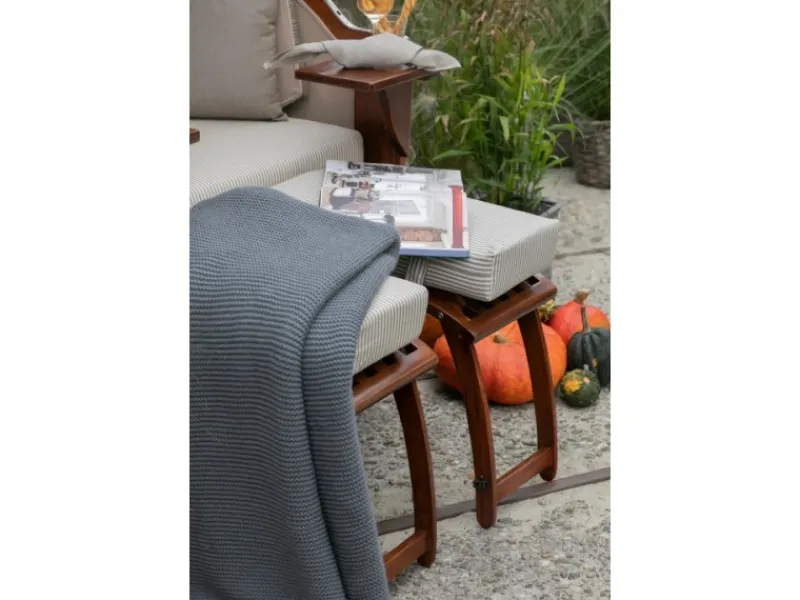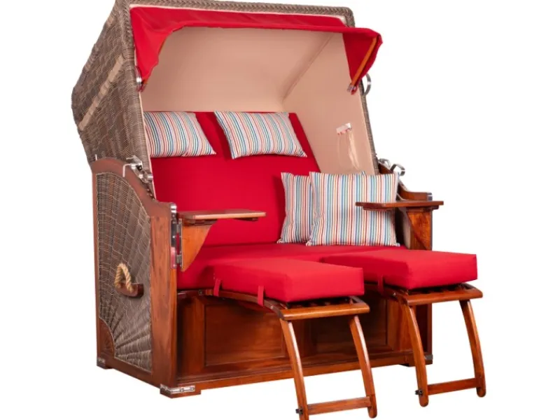 Herrliches Freizeit-Feeling mit dem Strandkorb Nordstrand Mahagoni Es muss ja nicht immer die Ost- oder Nordsee sein- auch in Ihrem eigenen Garten oder auf dem Balkon können Sie in einem unserer Strandkörbe mit Wechselpolster nach Herzenslust die Seele baumeln lassen. Die ausgesprochen exzellente und bis ins kleinste Detail ausgeführte hervorragende Verarbeitung weckt bei diesem Volllieger bereits die Lust, es sich nach der Betriebsamkeit des Alltags in diesem Strandkorb so richtig gemütlich zu machen. Auf Grund der Design- Vielfalt, die wir Ihnen bezüglich der Polsterung präsentieren, haben Sie die Möglichkeit, sich den Strandkorb Nordstrand nach Ihren ganz persönlichen Wünschen zu gestalten. So schaffen Sie sich einen unverwechselbaren und individuellen Rückzugsort mit charakteristischer Optik, der Sie auf hohem Niveau zur Entschleunigung einlädt. Hochwertiges Mahagoniholz Dass für den Strandkorb Nordstrand verwendete Mahagoniholz überzeugt durch seinen edlen, rötlich-braunen Farbton, der dem Strandkorb seinen klassischen und maritimen Charakter verleiht. Zudem sorgt das massive Mahagoniholz für Standfestigkeit und Stabiltität und macht den Strandkorb Nordstrand zu einem hochwertigen Gartenmöbel. Die Verwendung von Mahagoniholz im Außenbereich hat eine lange Tradition. Das besonders harte und damit witterungsbeständige Holz wird von jeher sowohl im Schiffsbau als auch im Gartenbereich eingesetzt. Somit eignet es sich auch für die Herstellung von Strandkörben besonders gut. Um das Mahagoniholz in seiner einzigartigen Optik zu erhalten, empfehlen wir die regelmäßige Lackierung des Holzes mit einem offenporigen PU-Lack. Diese Pflege macht den Strandkorb Nordstrand zu einem absoluten Highlight in Ihrem Garten oder auf Ihrer Terrasse. Langlebiges PE-Geflecht Die aufwendig gestaltete Flechtung des Strandkorbes wird in liebevoller Handarbeit für jeden Strandkorb einzeln erstellt. Die interessante Sonnenflechtung des Seitenteils und die akkurate Verarbeitung der Oberkorbs zeugen von hohem handwerklichem Geschick und verleihen dem Strandkorb Nordstrand sein klassisches Design. Das verwendete PE (Polyethylen)-Geflecht ist ideal für den Einsatz im Freien, denn es ist robust und temperaturbeständig, besonders auch bei hohen Temperaturschwankungen. Zudem ist die glatte Oberfläche des Geflechtes schmutz- und witterungsabweisend. Weitere Vorteile wie UV-Beständigkeit und Farbechtheit machen Ihren Strandkorb Nordstrand zu einem langjährigen Begleiter, an dem Sie lange Ihre Freude haben werden. Edelstahl und viele Extras Neben dem massiven Teakholz und beständigen PE-Geflecht verwenden wir für unseren Strandkorb Nordstrand ausschließlich hochwertige Edelstahlbeschläge aus V2A-Edelstahl. Diese Beschläge kommen bei der Befestigung der Bistrotische, der Verstärkung der unteren Ecken und beim Feststellmechanismus der Verstellgriffe zum Einsatz. Doch auch die verwendeten Schrauben, sowie die Haken zur Befestigung der abnehmbaren Fußstützen sind bewusst aus Edelstahl gewählt. Komplettiert wird der Strandkorb Nordstrand durch eine Vielzahl durchdachter Extras. Das großzügige Staufach unter der Sitzbank, die beiden Zeitungstaschen und die großen schwenkbaren Bistrotische sind praktische Details, die Ihre Auszeit im Strandkorb Nordstrand perfekt machen. Zudem sorgen extradicke Polster für einen bequemen Sitzkomfort. Der Strandkorb Nordstrand wird grundsätzlich mit farblich abgestimmten Wurf- und Nackenkissen geliefert, die sich variabel einsetzen lassen. Somit lässt der Strandkorb Nordstrand keine Wünsche offen – lassen Sie sich von unserer vielfältigen Auswahl inspirieren.