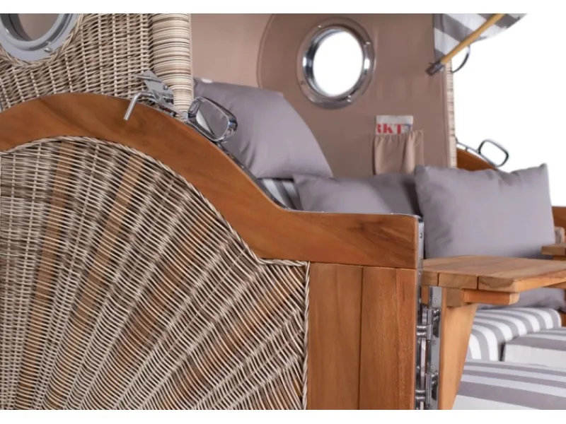 Strandkorb Rantum Grande – maritimes Design in seiner schönsten Form Nur die Nordsee ist schöner als dieser traumhafte Strandkorb, mit dem Sie sich maritimes Flair in den Garten holen. Der Strandkorb Rantum Grande macht seinem Namen alle Ehre: Edles Teakholz, Hochglanz-Bullaugen und eine üppige Polsterung machen den Volllieger zu einer wahren Wohlfühloase. Bei so viel Komfort kommt garantiert Urlaubsstimmung auf. Der Strandkorb Rantum Grande besticht mit einer durchdachten Mischung aus maritimen Details, hohem Komfort und luxuriöser Verarbeitung. Als Volllieger bietet der Strandkorb Rantum Grande ein Höchstmaß an Komfort. Auch in puncto Qualität genügt dieses Modell wie alle Strandkörbe der Rantum-Serie höchsten Ansprüchen. Der Strandkorb ist aus edlem Teakholz gefertigt und dadurch besonders widerstandsfähig gegenüber äußeren Witterungseinflüssen. Aufgelockert wird die massive Teak-Optik durch luftiges PE-Geflecht. Auch hierbei handelt es sich um ein sehr langlebiges und wetterfestes Material, das zudem schmutzabweisend und UV-beständig ist. Einem langjährigen intensiven Gebrauch steht also nichts im Wege. Das beidseitig eingelassene Bullauge zählt zu den besonderen Extras dieses Strandkorbes. Lehnen Sie sich zurück und genießen Sie den ungestörten Rundumblick, der an die Weiten von Nord- und Ostsee erinnert. Das Bullauge besteht aus Sicherheitsglas und ist in hochglänzendes Aluminium eingefasst. Damit bildet es die perfekte Ergänzung zu den übrigen Hochglanz-Beschlägen aus Edelstahl. Für einen optimalen Komfort verfügt der Strandkorb über eine großzügige Polsterung, bestehend aus extra dicken Sitz- und Fußkissen, Wurfkissen sowie Nackenkissen. Zwei schwenkbare Bistrotische und ausziehbare Fußbänke runden die üppige Ausstattung dieses Premium-Strandkorbes ab. Alle Bezüge bestehen aus hochwertigem Markisenstoff, sind abnehmbar und waschbar. Hochwertiges Teakholz rtigen Gartenmöbel. Teakholz ist ein besonders hochwertiges Holz und eignet sich aufgrund seiner hochwertig Eigenschaften hervorragend für Strandkörbe. Wir verwenden ausschließlich hochwertig produziertes Plantagen-Teakholz. Aufgrund seines hohen Öl- und Kautschukanteils hat Teakholz einen hochwertig Verwitterungs- und Alterungsschutz. Egal ob Sie die im Laufe der Zeit entstehende silbrig-graue Patina lieben oder den hochwertig hellen Farbton bevorzugen, der sich durch regelmäßiges Ölen des Holzes erhalten lässt – unser Teakholz überzeugt durch seine Langlebigkeit und die hochwertige Optik. Edelstahl und viele Extras Neben dem massiven Teakholz und beständigen PE-Geflecht verwenden wir für unseren Strandkorb Rantum ausschließlich hochwertige Edelstahlbeschläge aus V2A-Edelstahl. Diese Beschläge kommen bei der Befestigung der Bistrotische, der Verstärkung der unteren Ecken und beim Feststellmechanismus der Verstellgriffe zum Einsatz. Komplettiert wird der Strandkorb Rantum durch eine Vielzahl durchdachter Extras. So verfügt der Strandkorb Rantum nicht nur über eine extra-dicke Polsterung, sondern auch über farblich passende Wurfkissen und verstellbare Nackenkissen. Zeitungstaschen, integrierte Armlehnen, zwei große, schwenkbare und zudem abnehmbare Bistrotische lassen keine Wünsche offen und machen den Strandkorb Rantum bald auch zu Ihrem Lieblingsplatz im Garten oder auf der Terrasse.