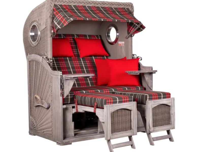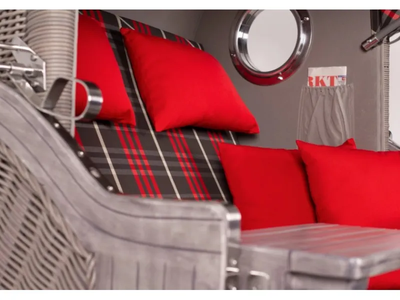 Edel und elegant: Strandkorb Rantum im Mahagoni-Design Dass Strandkörbe nicht nur am Strand eine gute Figur machen, ist schon länger bekannt. Den Beweis hierfür tritt allein schon der Strandkorb Rantum in der Mahagoni-Ausführung an. Das edle Vollholz verleiht dem Volllieger Strandkorb ein echt luxuriöses Aussehen. Kombiniert mit einem ungemein stilvollen Design rund um die typische Rattan-Optik und das integrierte Bullauge sorgt der Strandkorb Rantum regelrecht für visuelle Furore. Der als Ostseekorb gestaltete Volllieger Strandkorb optimiert seine optische Attraktivität zudem noch durch seine üppige Ausstattung. Ob ein Bullauge auf jeder Seite, die dicken Sitz- und Rückenpolster, den Seitenarmlehnen, die Beschläge aus Edelstahl oder auch die Nacken- und Fußkissen sowie die Wurfkissen – alle Komponenten fügen sich harmonisch in ein sowohl optisch als auch funktionell überzeugendes Gesamtbild ein. Für eine zusätzliche Prise Komfort sorgen einhängbare Fußbänke und schwenkbare Bistrotische. Hochwertiges Mahagoniholz Der Strandkorb Rantum überzeugt durch die besonders hochwertig verarbeiteten edlen Materialien. Das massive Mahagoni mit seinem grau-weißen Farbton verleiht dem Strandkorb Westerland seinen ganz besonderen Charakter und macht ihn zu einem qualitativ hochwertigen Gartenmöbel. Die Verwendung von Mahagoniholz im Außenbereich hat eine lange Tradition. Das besonders harte und damit witterungsbeständige Holz wird von jeher sowohl im Schiffsbau als auch im Gartenbereich eingesetzt. Somit eignet es sich auch für die Herstellung von Strandkörben besonders gut. Zudem wird der maritime Charakter unseres Strandkorbes Rantum mit den eingebauten Bullaugen durch den Einsatz von Mahagoni unterstrichen. Das besondere Design macht den Strandkorb Rantum zu einem absoluten Highlight in Ihrem Garten oder auf Ihrer Terrasse. Langlebiges PE-Geflecht Die aufwendig gestaltete Flechtung des Strandkorbes wird in liebevoller Handarbeit für jeden Strandkorb einzeln erstellt. Die interessante Sonnenflechtung des Seitenteils und die formschöne Einbindung des Bullauges zeugen von hohem handwerklichem Geschick und verleihen dem Strandkorb Rantum ein außergewöhnliches und einzigartiges Design. Das verwendete PE (Polyethylen)-Geflecht ist ideal für den Einsatz im Freien, denn es ist robust und temperaturbeständig, besonders auch bei hohen Temperaturschwankungen. Zudem ist die glatte Oberfläche des Geflechtes schmutz- und witterungsabweisend. Weitere Vorteile wie UV-Beständigkeit und Farbechtheit machen Ihren Strandkorb Rantum zu einem langjährigen Begleiter, an dem Sie lange Ihre Freude haben werden. Edelstahl und viele Extras Neben dem massiven Mahagoniholz und beständigen PE-Geflecht verwenden wir für unseren Strandkorb Rantum ausschließlich hochwertige Edelstahlbeschläge aus V2A-Edelstahl. Diese Beschläge kommen bei der Befestigung der Bistrotische, der Verstärkung der unteren Ecken und beim Feststellmechanismus der Verstellgriffe zum Einsatz. Komplettiert wird der Strandkorb Rantum durch eine Vielzahl durchdachter Extras. So verfügt der Strandkorb Rantum nicht nur über eine extra-dicke Polsterung, sondern auch über farblich passende Wurfkissen und verstellbare Nackenkissen. Zeitungstaschen, integrierte Armlehnen, zwei große, schwenkbare und zudem abnehmbare Bistrotische und ein praktisches Staufach unterhalb der Sitzfläche lassen keine Wünsche offen und machen den Strandkorb Rantum bald auch zu Ihrem Lieblingsplatz im Garten oder auf der Terrasse.