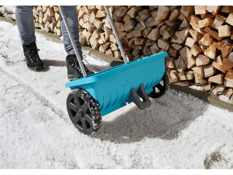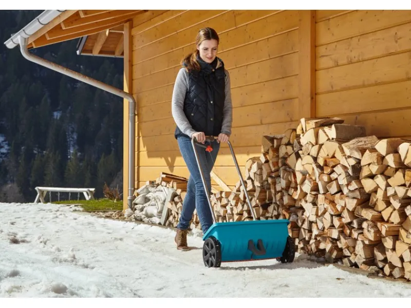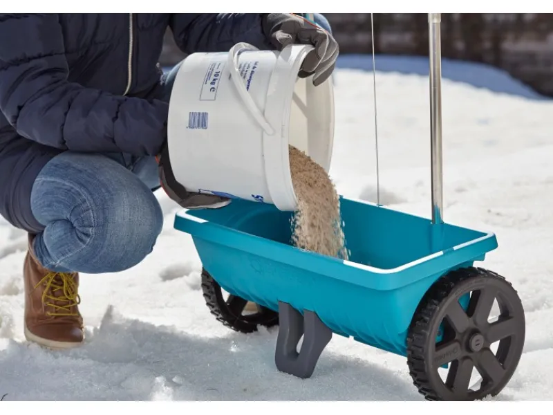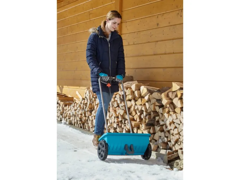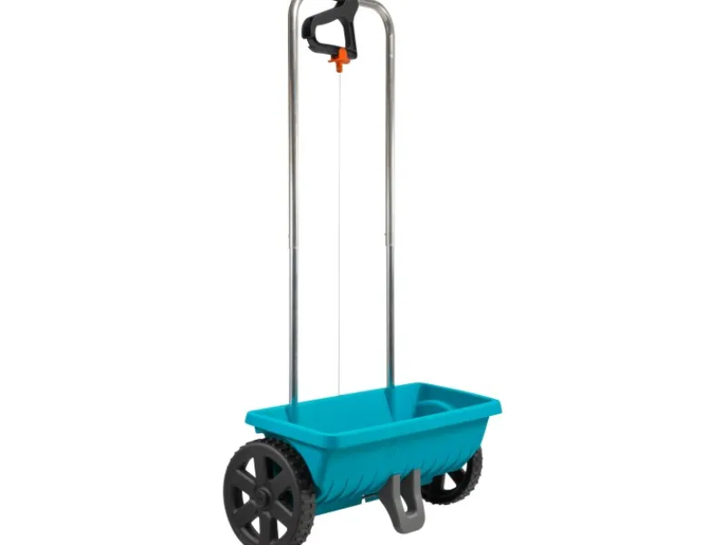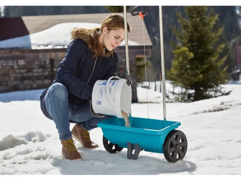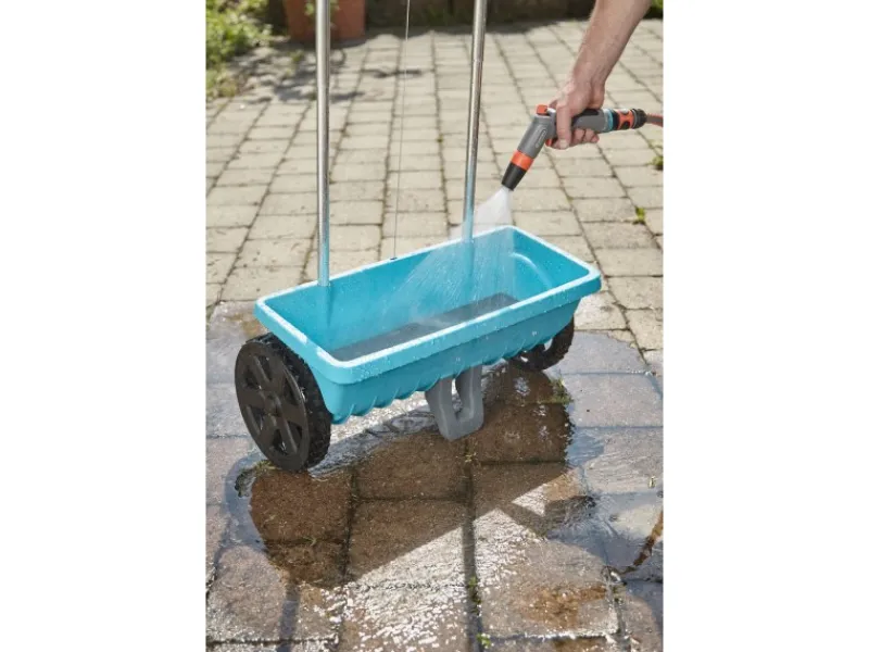 Der Streuwagen L ist aus korrosions- und witterungsbeständigem Material gefertigt und kann leicht mit Wasser gereinigt werden. Er kann mit Streugut unterschiedlicher Korngröße verwendet werden, mit Dünger, Samen, Granulaten, Sand und Streusalz. Damit ist er ganzjährig einsetzbar, sowohl im Sommer, als auch im Winter.