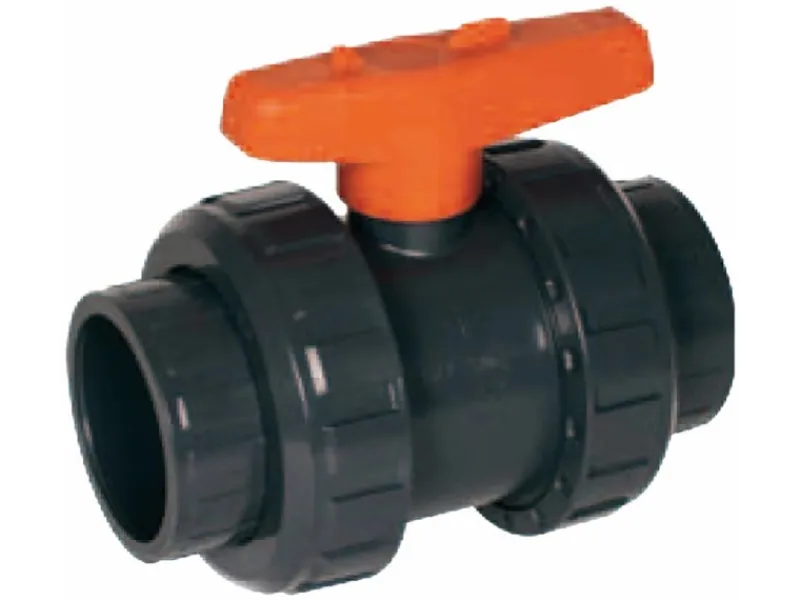 PVC-Kugelhahn 50 mm mit zwei Klebemuffen, in die ein PVC-Rohr oder Fitting mit einem Klebestutzen eingeklebt werden kann. Gummierter Griff.
