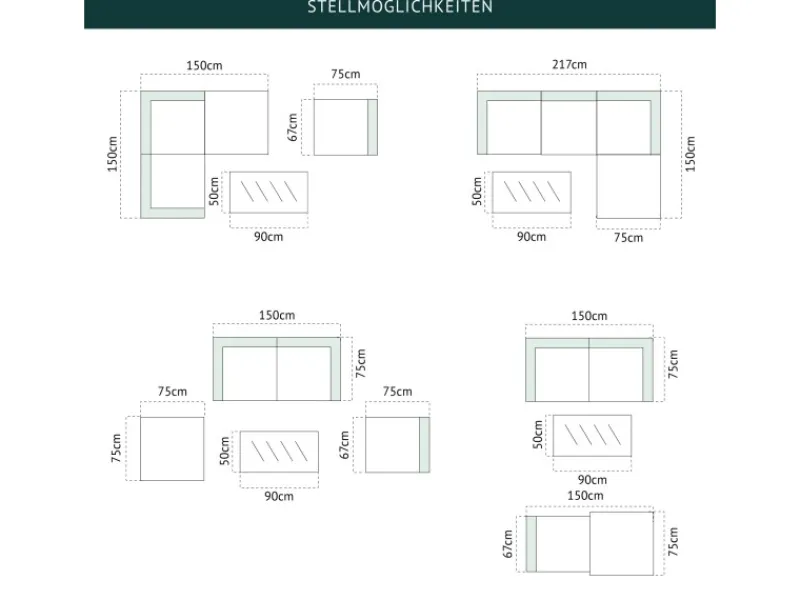 Tisch, Ecksofa, Sofa und Hocker ermöglichen verschiedene Stellmöglichkeiten für jeden Anlass