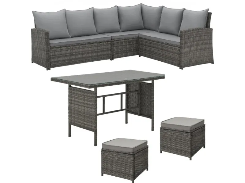 Die gut gepolsterten Auflagen und die sieben dazugehörigen Kissen in Grau sorgen für hohen Sitzkomfort und lassen sich dank der abnehmbaren Bezüge mühelos in der Waschmaschine reinigen.