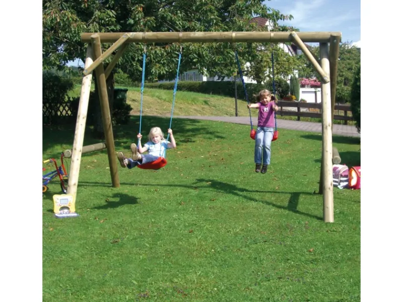 Die Doppelschaukel ist drei Meter lang und bereitet Ihren Kindern mit den zwei Schaukelbrettern viel Spiel, Spaß und Freude. Die Schaukeln sind mit verschleißfesten Schellen am Gestell befestigt, sodass Ihre Kinder sicher schaukeln können.