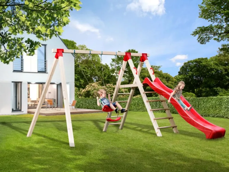 Die stabilen, roten Kunststoffsitze bieten nicht nur Komfort, sondern sind auch besonders pflegeleicht. Die Klettereinheit mit Podest fördert die motorischen Fähigkeiten und lädt kleine Abenteurer dazu ein, ihre Geschicklichkeit zu testen. Zudem ist die Wellenrutsche mit einer Länge von 290 cm ein weiteres Highlight dieser Schaukel.