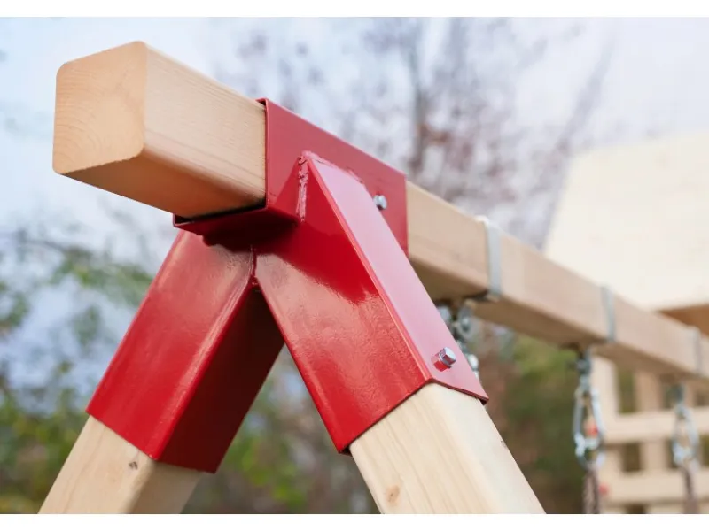 Die Verbindungselemente aus rotem Metall setzen nicht nur einen modernen Akzent, sondern sorgen auch für eine sichere Konstruktion.