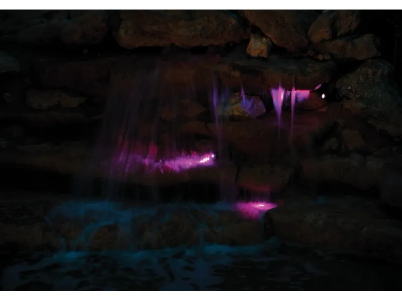 Geeignet für den Einsatz über und unter Wasser (IP 68) und inklusive 12 V – Sicherheitstrafo und 2 m + 3 m + 2x 2 m Kabellänge.