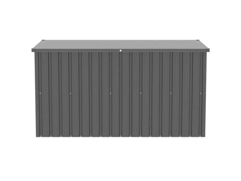 Hergestellt aus verzinktem Stahlblech, ist die Box äußerst langlebig und praktisch wartungsfrei. Die spezielle Pulverbeschichtung schützt sie vor Zersetzung durch langfristige Niederschläge. Der leichtgängige, aufklappbare Deckel mit zwei Gasdruckfedern erleichtert das Verstauen von Gegenständen erheblich. Ein integriertes Schloss sorgt für zusätzliche Sicherheit und unterstreicht den praktischen Charakter der Box.
