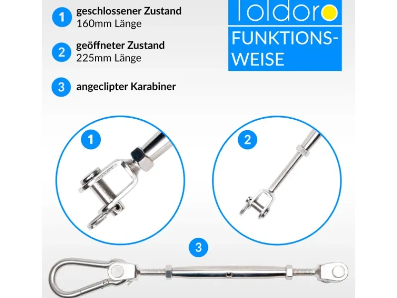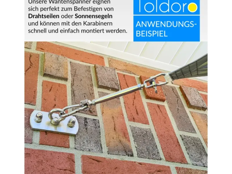 Das Toldoro Befestigungsset sorgt für eine sichere Montage und Spannung von Sonnensegeln und Seilen.