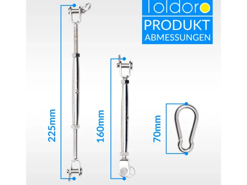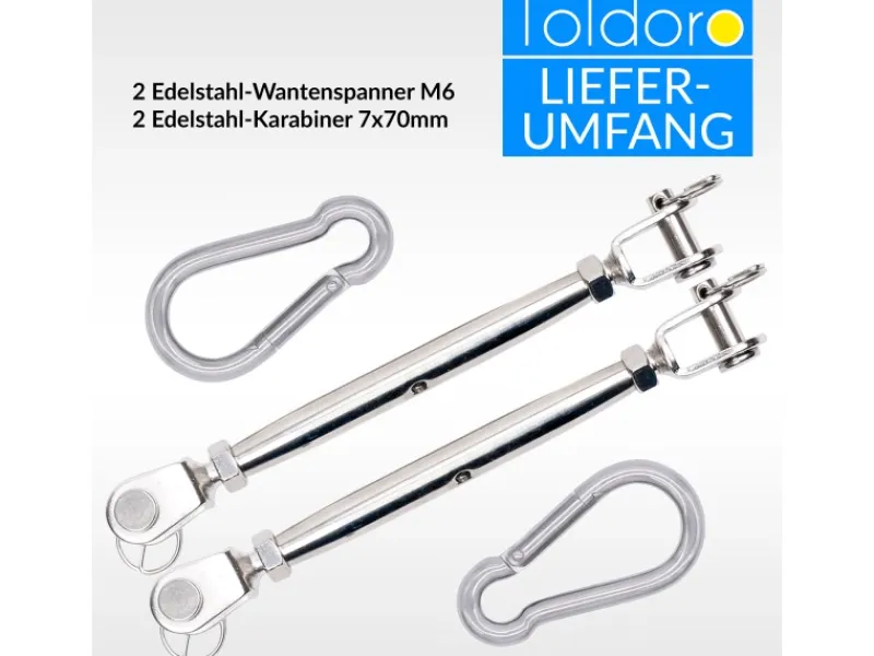 Be the first to review “Toldoro Sonnensegel|2 Sonnensegelspanner M6 & 2 Karabiner 70mm Wantenspanner Karabinerhaken Edelstahl Seilspanner für Sonnensegel” Antworten abbrechen