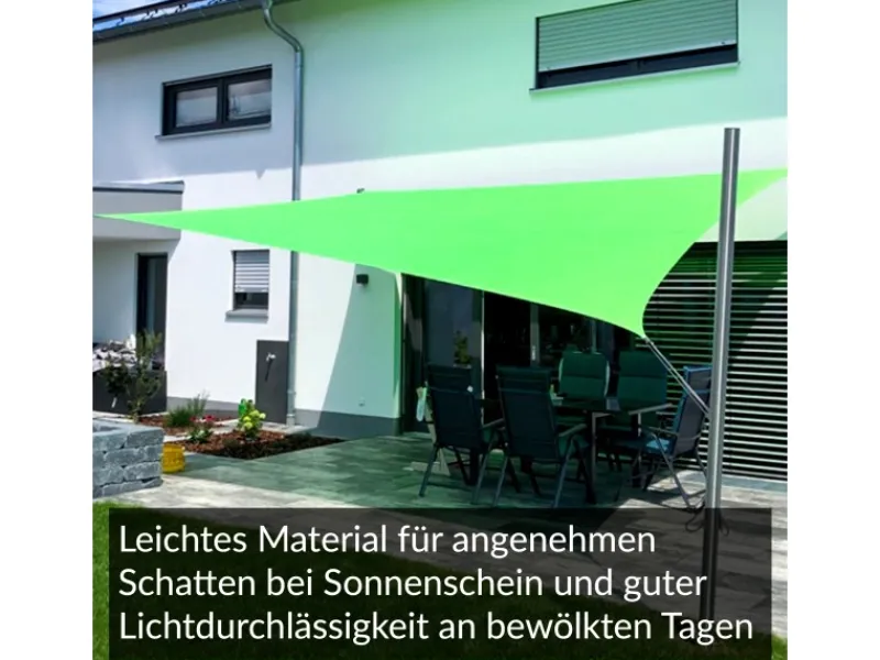 Wetterschutz im Garten: Sonnensegel mit Regenschutz und UV-Schutz UPF50+Suchen Sie zuverlässigen Schutz vor Sonne und Regen? Dieses hochwertige Sonnensegel bietet genau das! Gefertigt aus robustem PES-Stoff, lässt es sich mit wenigen Handgriffen spannen und schafft einen großzügigen Schattenbereich. Der langlebige Stoff mit einer Dichte von ca. 160 g/m² und die rundumlaufenden Gurtbänder sorgen für Stabilität und eine lange Lebensdauer.An heißen Tagen spendet das straff gespannte Sonnensegel wohltuenden Schatten und schützt dank seines UV-Schutzes mit UPF50+ effektiv vor schädlicher Sonneneinstrahlung. Gleichzeitig bleibt die Luftzirkulation ungehindert – ideal für Terrassen und Gärten. Dank dieser Belüftungseigenschaft bleiben die darunterliegenden Bereiche angenehm kühl, selbst bei hohen Temperaturen.Auch bei schlechtem Wetter überzeugt das wasserabweisende Sonnensegel: Es schützt zuverlässig vor Niederschlägen und ist windstabil bis Windstärke 7 (ca. 65 km/h). Perfekt für den Einsatz im Garten, auf Terrassen oder bei Outdoor-Events. Durch seine regendichte Verarbeitung schützt es Möbel, Sandkästen und andere Gegenstände effektiv vor Nässe.Ein weiterer Vorteil: Das Sonnensegel dient nicht nur als Wetterschutz, sondern auch als Sichtschutz – ideal für Terrassen und Innenhöfe. Mit dem integrierten UV-Schutz UPF50+ und der robusten Verarbeitung sind Sie bestens gerüstet, um ungestört und wetterunabhängig Ihre Zeit im Freien zu genießen!