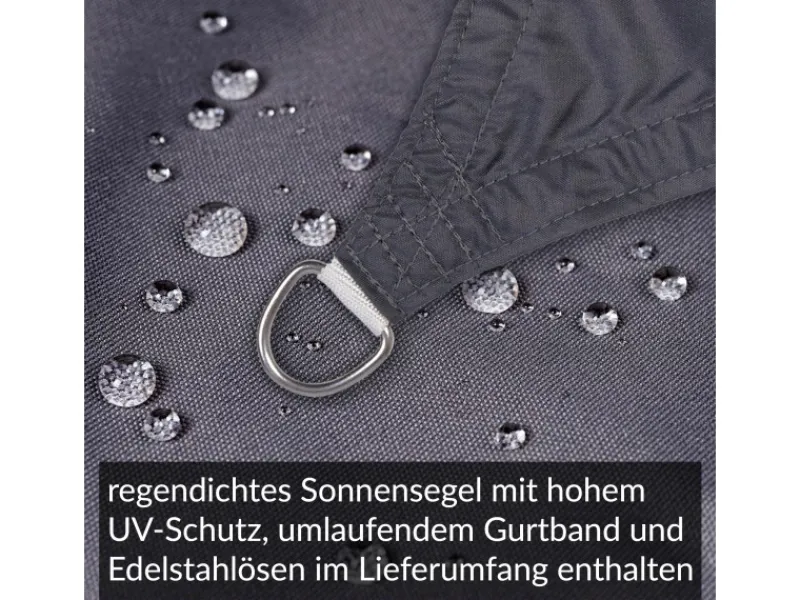 Das dreieckige Sonnensegel aus PES-Gewebe bietet Ihnen zuverlässigen Schutz vor Sonneneinstrahlung dank UV-Schutz UPF50+, der über 98 % der UV-Strahlen blockiert. Es ist regendicht und hält auch plötzlichen Sommerregen stand, sodass Sie Ihre Zeit im Freien entspannt genießen können. Mit einem Flächengewicht von ca. 160 g/m² ist das Segel leicht, einfach zu spannen und durch das konkave Design optimal für eine gleichmäßige Spannung geeignet.