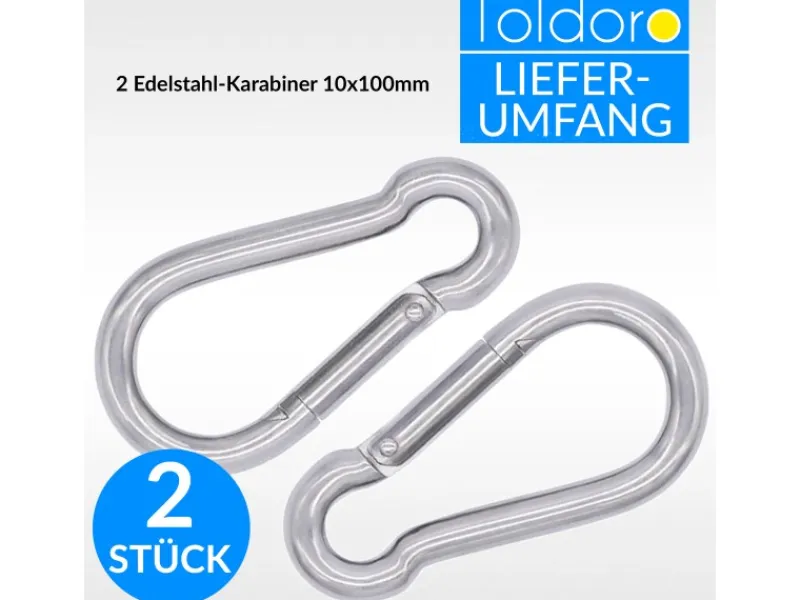 Der praktische Klappmechanismus ermöglicht ein schnelles Öffnen und Schließen ohne Werkzeug. Dadurch eignen sie sich ideal für Verbindungen, etwa zwischen Sonnensegeln und Wandösen. Ihre hohe Zuglast und einfache Handhabung machen sie vielseitig einsetzbar.Warum V4A-Edelstahl?
