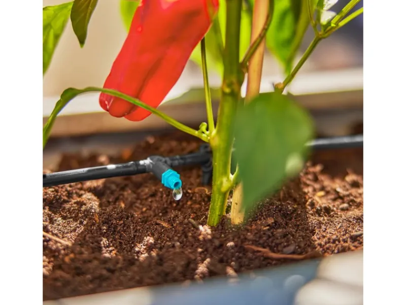 Das Bewässerungs-Set umfasst neben den Reihentropfern regulierbare Endtropfer. Diese haben den Vorteil, dass Sie die Wasserabgabe zwischen 0 l/h und 15 l/h individuell anpassen können. So versorgen Sie auch Pflanzen mit unterschiedlichem oder steigendem Wasserbedarf optimal.