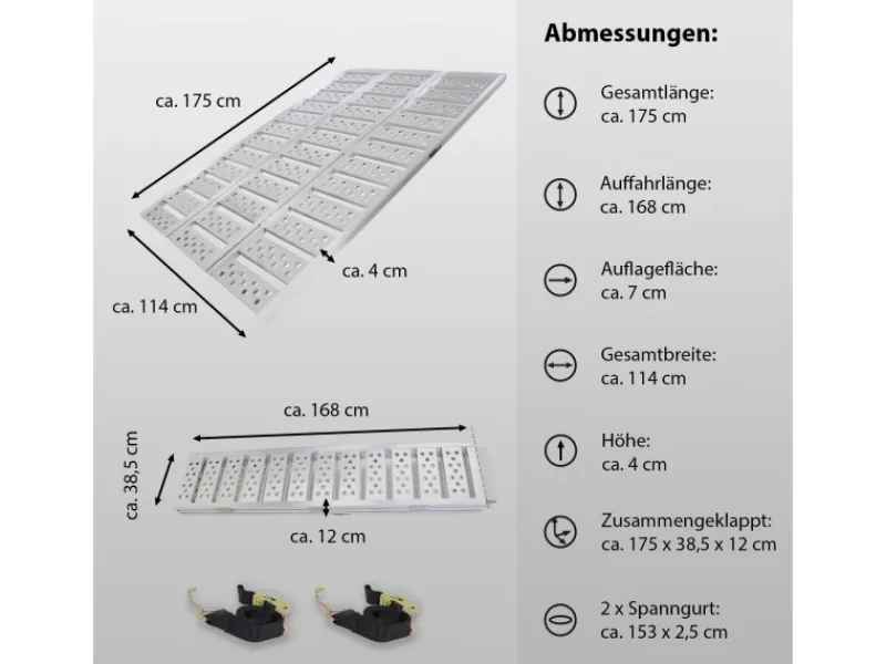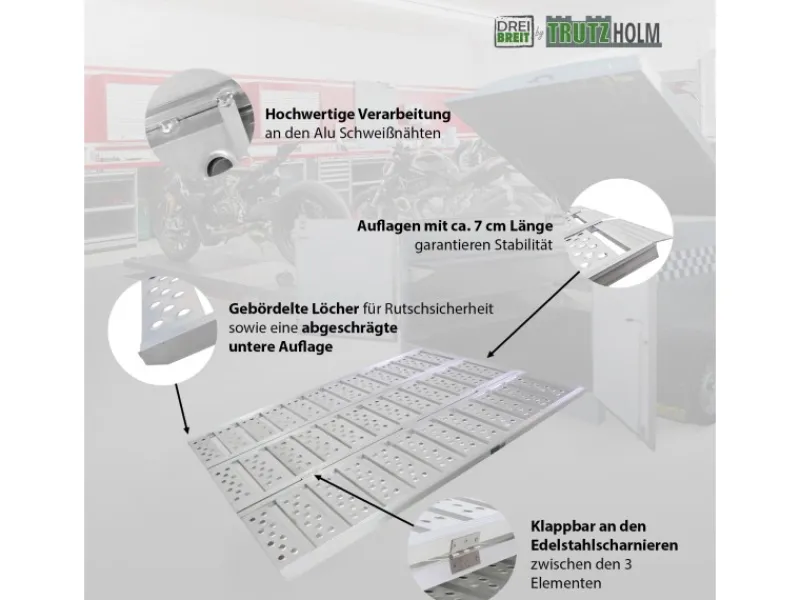 Der ideale Begleiter für jeden Motorradfahrer und Anhängerbesitzer! Die DREIBREIT® by TRUTZHOLM® Auffahrrampe bietet ausgeklappt mit einer Breite von 114 cm ein einfaches und sicheres Verladen Ihrer Fahrzeuge. Die extra breite Rampe gewährleistet, dass die verladende Person und Motorrad sicher auf gleicher Höhe stehen ohne Stufen überwinden zu müssen. Durch die stabile Aluminium Bauweise können auch Quads, Kleinfahrzeuge und Rasentraktoren bis zu einem Gesamtgewicht von 1020 kg, bei gleichmäßiger Belastung mithilfe der Rampe verladen werden. Dank der robusten Fertigung aus leichtem Aluminium mit einem Gewicht von 13,5 kg je Stück erweist sich die Auffahrrampe als äußerst witterungsbeständig und langlebig. Zudem erleichtert die klappbare Bauweise die Handhabung und ermöglicht eine platzsparende Lagerung. Serienmäßig werden die Auffahrrampen mit drei Auflagen zur einfachen Positionierung geliefert. Die leichte und stabile Konstruktion, die rutschfesten Oberflächen und die Spanngurte sorgen für die sichere und zuverlässige Nutzung. Eigenschaften: Sehr stabile Ausführung, trotzdem sehr leicht, da aus massiven Aluminium gefertigt. Hochwertige Verarbeitung an den Alu-Schweißnähten. Sehr breite Fläche mit gebördelten Löchern für sicheren Halt. 3-fach faltbar für platzsparenden Transport / Aufbewahrung. Die Elemente sind mit 3 stabilen Edelstahlscharnieren verbunden. Tragkraft bis 1.020 kg bei gleichmäßiger Verteilung der Last und einem Achsabstand von >80 cm | 340kg je Elemente (Luftbereifung aus Gummi) Min. Ladehöhe: 30 cm bei 17% Steigung. Max. Ladehöhe: 53 cm bei 30 % Steigung. Maße: 175 x 114 x 4 cm (LxBxH) – Auffahrlänge: 168 cm zusammengeklappt nur 38,5 cm breit und 12 cm hoch Laufflächenbreite: 113,6 cm Gewicht nur 13,5 kg Spanngurt mit Haken und Klemme, zur Sicherung der Rampe an Anhänger oder Transporter