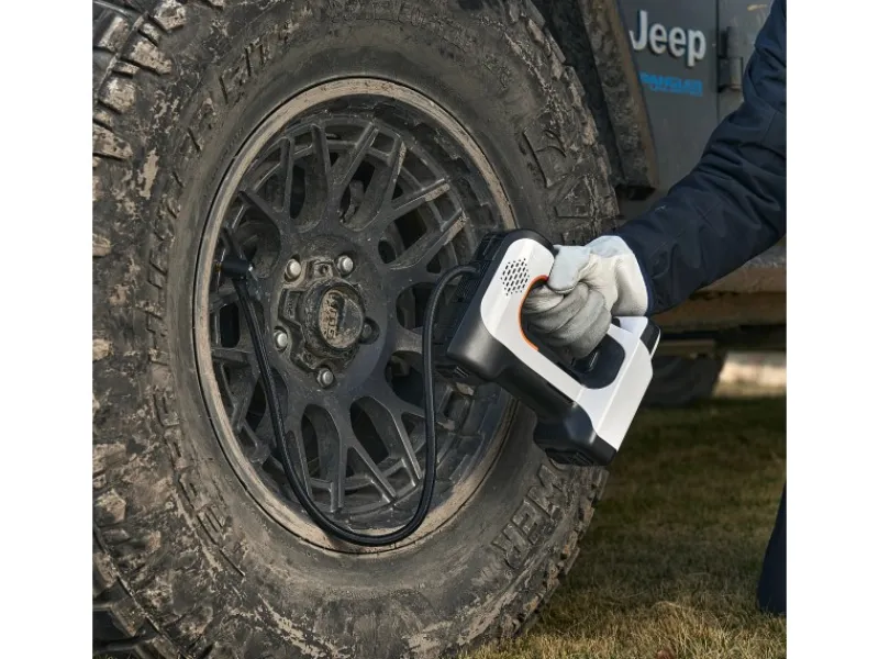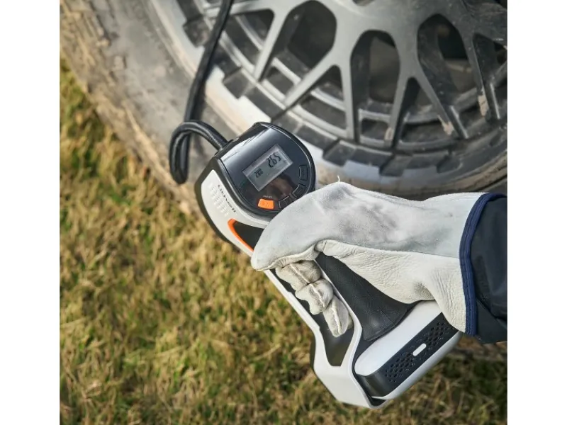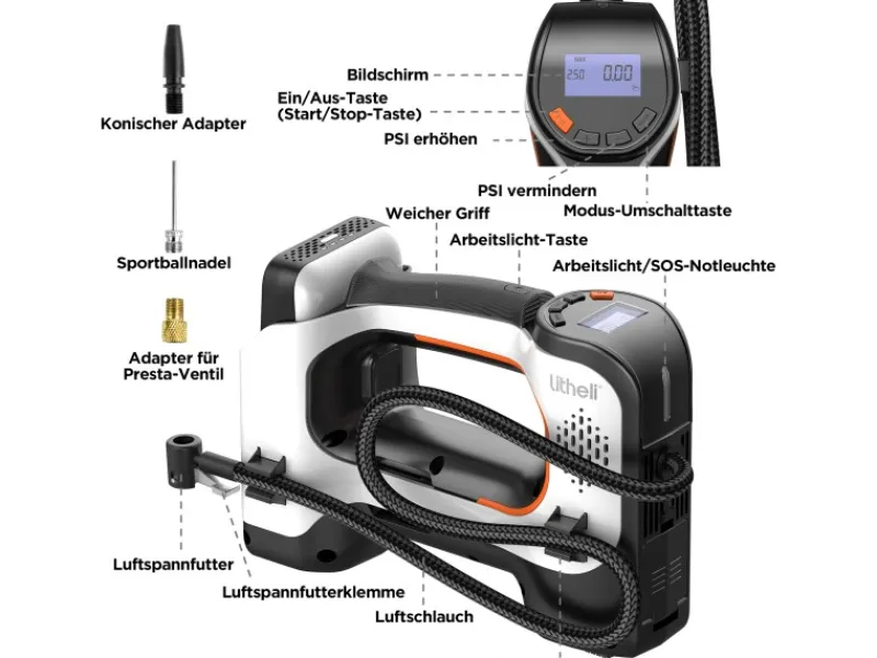 Das eingebaute LED-Arbeitslicht sorgt für eine gute Beleuchtung und kann auch als SOS-Notleuchte verwendet werden. Die Aufblasvorrichtung stoppt automatisch das Aufblasen, wenn der voreingestellte Druck erreicht ist, um einen überhöhten Luftdruck zu verhindern. Nach einer Minute ohne Betrieb schaltet sich der Kompressor automatisch ab, um Energie zu sparen. Zudem ist die Druckluftpumpe auf Luftdichtigkeit geprüft, um eine stabile Luftabgabe und eine höhere Aufpumpleistung zu gewährleisten.