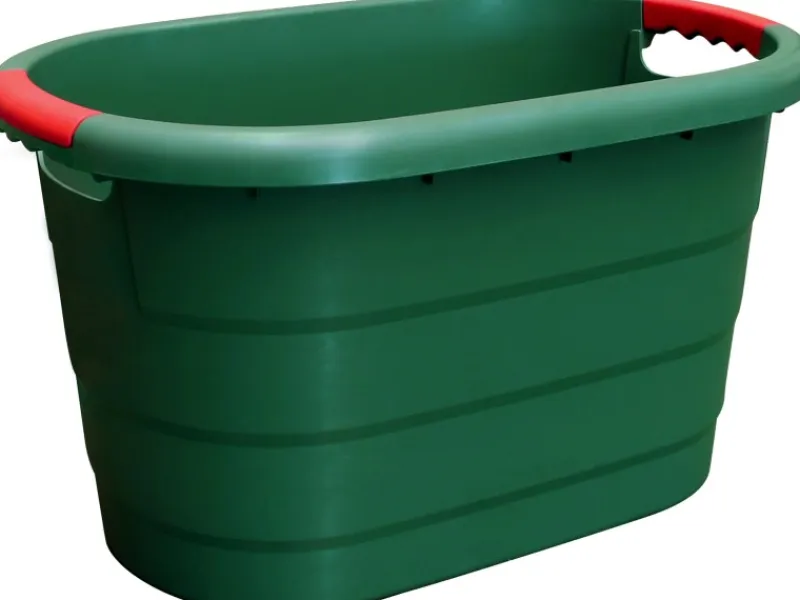Der Behälter ist mit zwei stabilen, handgerechten Tragegriffen ausgestattet. Die ovale, sehr stabile Ausführung dient der Verformungssicherheit. Innen und außen besitzt der Behälter eine glatte Oberfläche und ist daher sehr leicht zu reinigen. Zudem ist der Behälter besonders UV-stabil, witterungsbeständig und langlebig. Hergestellt aus zähem, dickwandigen Kunststoff (Polypropylen).