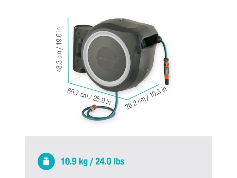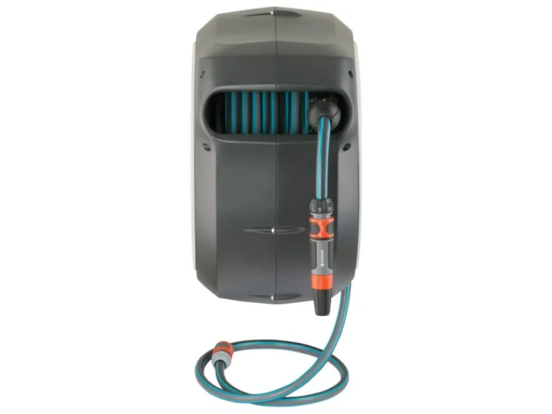 Inkl. Gardena 25 m Schlauch, 1,5 m flexibler Anschlussschlauch, Systemteilen, Spritze und Wandhalterung