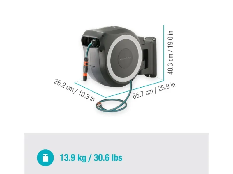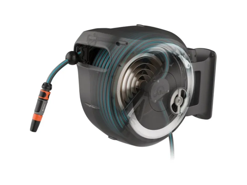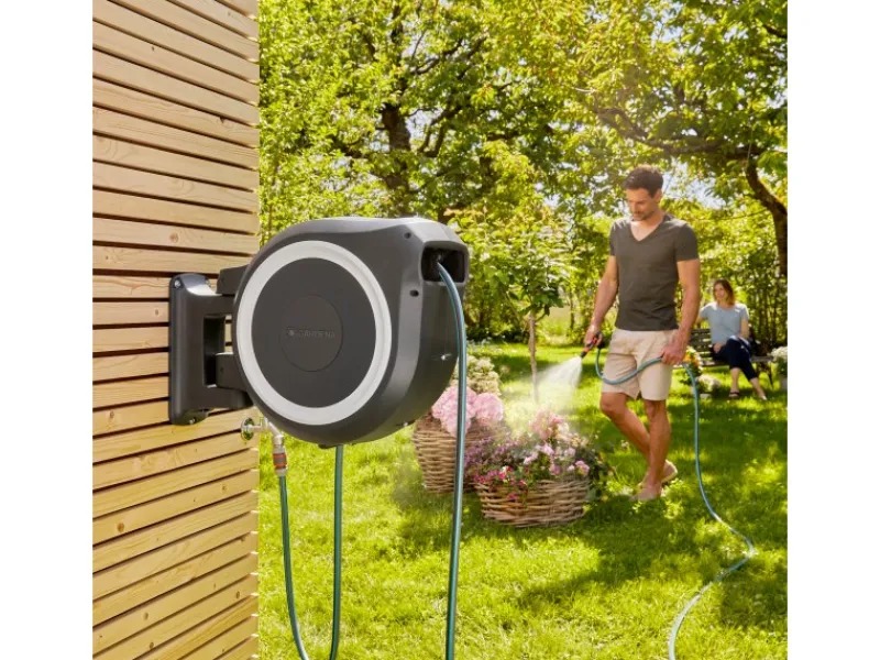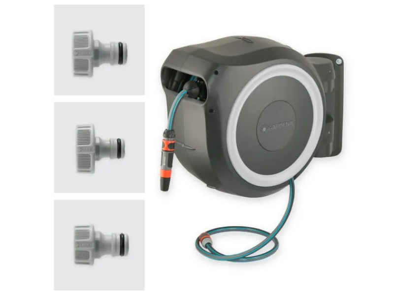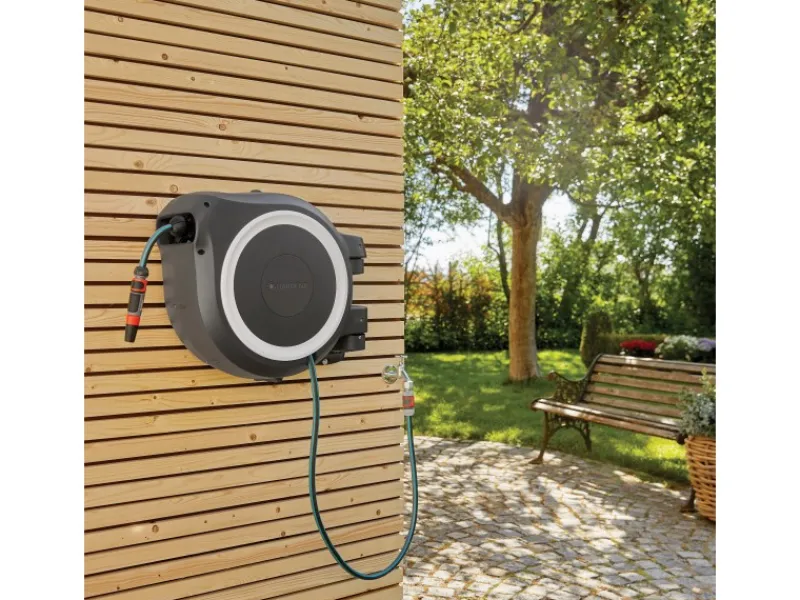 Inkl. Gardena 35 m Schlauch, 1,5 m flexibler Anschlussschlauch, Systemteilen, Spritze und Wandhalterung