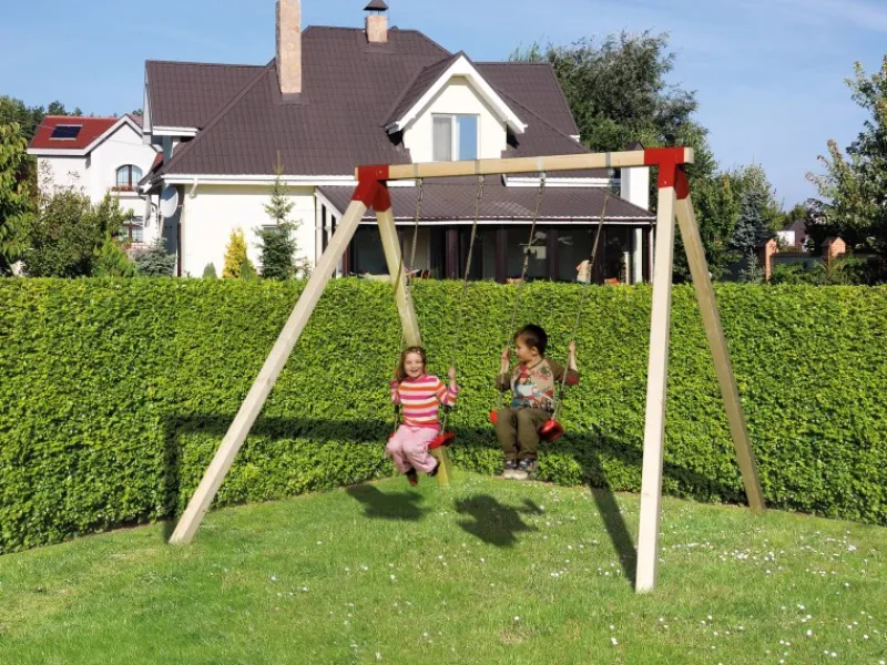 Im Lieferumfang enthalten sind 2 stabile, rote Schaukelsitze aus Kunststoff, reißfeste Seile und vier Schaukelhaken.