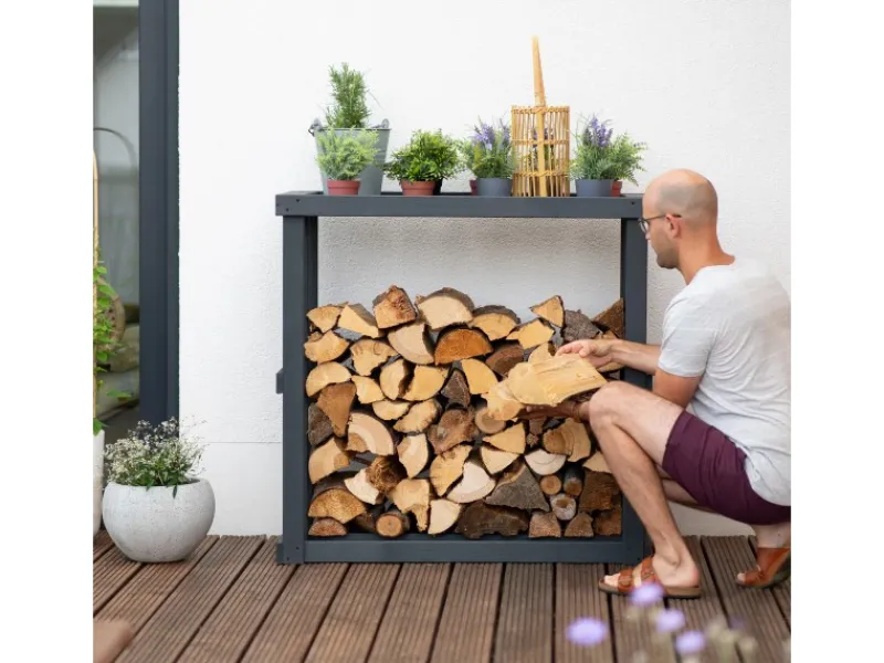 Minimalistisches Design, maximale Funktion – das Kaminholzregal Harald von Westmann punktet mit einer funktionalen Holzkonstruktion, einfacher Nutzbarkeit und einer dekorativen Ablagefläche.Elegantes Design, einfaches Handling – mit dem ansprechenden Brennholzregal Harald von Westmann bringst du im Handumdrehen Ordnung in dein Brennholz. Die Holzkonstruktion des Regals ist in modernem Anthrazit gebeizt und passt sich somit selbstverständlich der Umgebung an. Dank der offenen Gestaltung der Lagerfläche kannst du dein Brennholz problemlos darin stapeln, und hast es es somit immer griffbereit. Das Kaminholzregal wird von einer praktischen Ablagefläche getoppt, die du mit Pflanzen, Windlichtern und anderer Dekoration an deinen individuellen Wohnstil anpassen kannst.