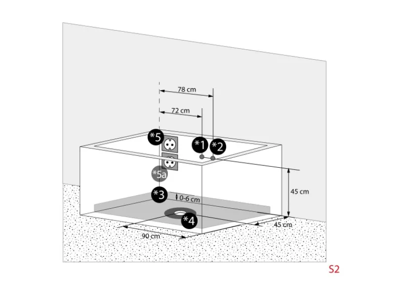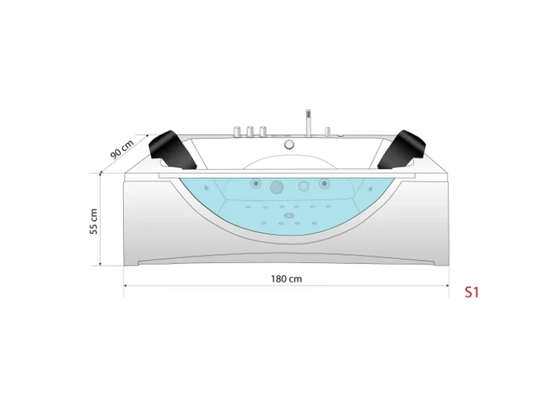 Ein Whirlpool der neuesten Generation erwartet Sie. Der Pool wird Ihnen nach Vorprüfung und Komplettmontage anschlussfertig ausgeliefert. Die Außenmaße des Pools: 180cm x 90cm x 55cm (LxBxH). Für zwei Personen ausreichend Platz, Wasserbedarf nur 130-160 Liter mit einer Person im Pool, bei zwei Personen weniger. Der einmalige Wasserfall wird zum Befüllen der Wanne benutzt. Der Pool verfügt über besonders leistungsstarke Pumpen (Luft & Wasser). Der Pool wird aus 100% Acryl (glasfaserverstärkt) hergestellt, KEIN ABS oder Mix aus anderem Material. Aus Acryl kann man Kratzer besser entfernen, da sieht dann der Pool auch nach vielen Jahren noch wie neu aus! Ausstattung: – mit Heizung 1500W mit Temperaturwahl zum Halten der Wassertemperatur über Stunden – Air-Pumpe 350W für Luftsprudel – Wasser-Pumpe 750W für Wassermassage – Stromanschluss 220V-240 / 50Hz – Steuerungsdisplay für alle elektrischen Funktionen, Bluetooth-Radio mit Lautsprecher – 1x Farblichtspot mit 7 Farben unter Wasser – 2 schwarze Nackenkissen – komplettes Armaturen-Set mit herausziehbarer Brause – Wassereinfüllsystem mit Farbwechsler und zweifacher Wasserfall – komplette Armaturen bereits eingebaut – Wasserfall, Ab- und Überlaufgarnitur, sowie mit herausziehbarer Handbrause – Auslieferung komplett anschlussfertig inkl. Schürze – Rahmen aus Stahl Vollverzinkt mit höhenverstellbaren Füßen – 10 Düsen für Wassermassage / 2 einzeln verstellbare Turbojets, sowie 8 starre Rückenjets – 12 Air-Jets für Luftsprudel im Boden – passive Restwasserentleerung – ein Wasserstandssensor zum Schutz der Pumpe. – Variante A wird geliefert mit der langen Frontschürze, sowie mit der kurzen Schürze an der rechten Seite – im Lieferumfang sind zwei HT50 Rohre, je 1x 50cm und 1x 100cm lang, ein HT50 45 Winkel sowie ein Viega-Abfluss, all dies Made in Germany – Anschluss-Maße (Skizze S2): *1 Warm- und *2 Kaltwasser, auch gegenüberliegend möglich, *3 Bereich für Abflussrohre, *4 freier Bereich um den Abfluss-Siphon, *5 Stromanschluss, *5a Stromanschluss nur Variante Radio – dieser Pool passt im Ganzen durch eine 70cm sowie 82cm Standard-Tür. Jeder Pool wird bei uns im Lager vor dem Versand ausgepackt und einer optischen Prüfung unterzogen. Anschließend wird der Pool auf einem speziellen Prüfstand mit Wasser gefüllt und das ganze System auf Dichtheit überprüft. Ebenfalls geprüft werden die Pumpen, das Licht und alle anderen elektrischen Funktionen. Erst dann wird der Pool erneut verpackt und versendet. Der Pool kommt komplett endmontiert, es muss nur noch Strom, Wasser und Abwasser angeschlossen werden, FERTIG.
