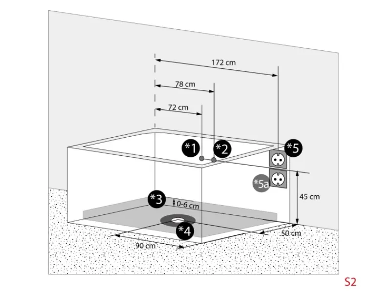 Ein Whirlpool der neuesten Generation erwartet Sie. Der Pool wird Ihnen nach Vorprüfung und Komplettmontage anschlussfertig ausgeliefert. Die Außenmaße des Pool: 180 x 90 x 55 cm (LxBxH) Für zwei Personen ausreichend Platz, Wasserbedarf nur 150 Liter mit einer Person im Pool, bei zwei Personen weniger. Der Pool verfügt über besonders leistungsstarke Pumpen. Der Pool wird aus 100% Acryl (glasfaserverstärkt) hergestellt, KEIN ABS oder Mix aus anderem Material. Aus Acryl kann man Kratzer besser entfernen, da sieht dann der Pool auch nach vielen Jahren noch wie neu aus! Dieser Whirlpool hat auch noch eine ganz besondere Funktion. Hier hat man die Möglichkeit nach jedem Bad die Schläuche aktiv von Innen zu reinigen. Dazu kann man die Armatur so schalten, das man die Schläuche mit sauberen (am besten heißem) Wasser für 2-3 Minuten ausspült. Somit wird vorgebeugt, das sich Schmutz und Seifenreste im Inneren der Schläuche ablagert und der Pool zur Bakterienfalle wird. Die Schläuche des Pools sind so angeordnet, das diese nahezu vollständig leer laufen. Ausstattung – Wasser-Pumpe 1100W für Wassermassage – Stromanschluss 220V-240 / 50Hz – Komplette Armaturen bereits eingebaut – Natürlich mit herausziehbarer Brause – Thermostat Armatur mit Umschalter, Grundkörper aus Messing / hochwertig verchromt – Massagedüsen seitlich, 2x verstellbare Jet Düsen für Wasser, sowie 8 starre Massagedüsen – passive Restwasserentleerung der Schläuche, aktive Reinigungsfunktion der Schläuche – Variante C wird geliefert mit langer Frontschürze, sowie kurzer Schürze für die linke Seite – Anschluss-Maße (Skizze S2): *1 Warm- und *2 Kaltwasser, auch gegenüberliegend möglich, *3 Bereich für Abflussrohre, *4 freier Bereich um den Abfluss-Siphon, *5 Stromanschluss, *5a Stromanschluss nur Variante Radio – dieser Pool passt im Ganzen durch eine 70cm sowie 82cm Standard-Tür Jeder Pool wird bei uns im Lager vor dem Versand ausgepackt und einer optischen Prüfung unterzogen. Anschließend wird der Pool auf einem speziellen Prüfstand mit Wasser gefüllt und das ganze System auf Dichtheit überprüft. Ebenfalls geprüft werden die Pumpen, das Licht und alle anderen elektrischen Funktionen. Erst dann wird der Pool erneut verpackt und versendet. Der Pool kommt komplett Endmontiert, es muss nur noch Strom, Wasser , Abwasser und die Frontschürze angeschlossen werden, FERTIG.