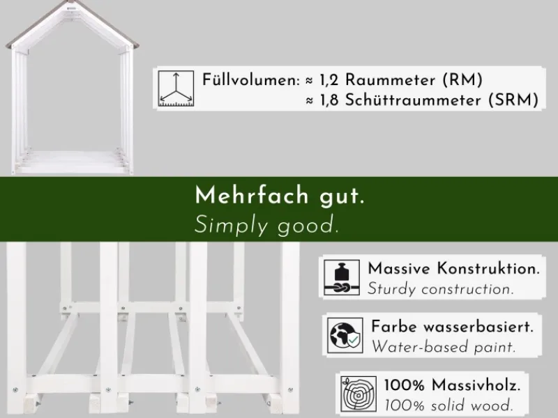 Holz-Füllvolumen: 1,2 Raummeter (RM) / 1,8 Schüttraummeter (SRM)
