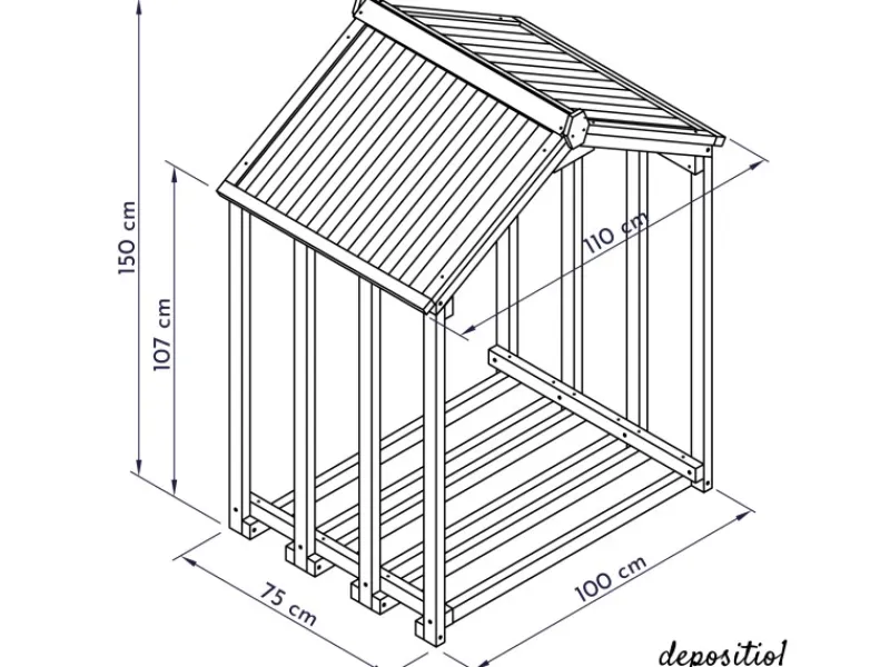 Hallo, ich bin „depositio1“ aus der Familie „WONDERMAKE“, Dein neues modernes Kaminholzregal mit Spitz-Dach und Wasser-Ablauf aus Holz für Outdoor draußen für 1,2 Raummeter (RM) / 1,8 Schüttraummeter (SRM). Meine Maße: 110 x 75 x 150 cm (BxTxH)