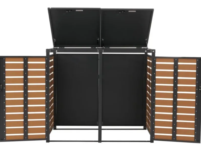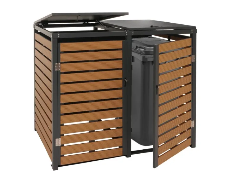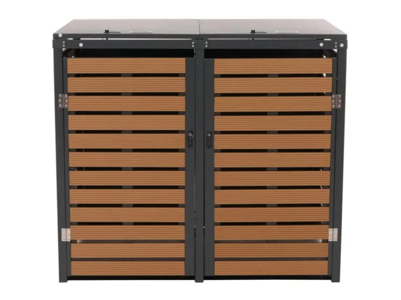 Die Kombination aus WPC-Paneelen und verzinktem Stahlrahmen sorgt für eine besonders langlebige und wartungsarme Konstruktion. Durch das klare, moderne Design fügt sich die Verkleidung harmonisch in jeden Außenbereich ein – ob Garten, Terrasse oder Einfahrt. Der Deckel lässt sich bequem öffnen, während die abschließbaren Türen für Sicherheit und Ordnung sorgen. Dank der Belüftungsschlitze bleibt das Innere stets gut durchlüftet. Eine stabile, pflegeleichte und optisch ansprechende Lösung, um Ihre Mülltonnen elegant zu verbergen und den Außenbereich aufzuwerten.