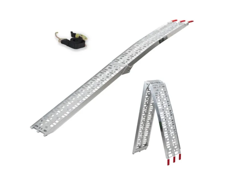 Achtung! Nicht für Kettenfahrzeuge und Minibagger geeignet!Lieferumfang:1 x Alu Auffahrrampe schwarz, montiert1 x Spanngurt zum Sichern der Rampe1 x BedienungsanleitungLänge ausgeklappt – Gesamtlänge (mit Auflagen)228 cmLänge ausgeklappt – Auffahrlänge (ohne Auflagen)219 cmLänge Auflage9 cmBreite außen28 cmLaufflächenbreite27,5 cmHöhe (ausgeklappt)5 cmLänge | Breite | Höhe (zusammengeklappt)116 cm | 28 cm | 14,5 cmmin. Auffahrhöhe-max. Auffahrhöhe68,0 cmmin. Steigung-max. Steigung30% | 16,70°Tragkraft je Stück, bei min. 80cm Achsabstand (Luftbereifung aus Gummi)340 kgArtikelgewicht je Stück7 kggeeignet für KettenfahrzeugeneinMaterialAluminiumBauweisezusammenklappbarFarbegrau