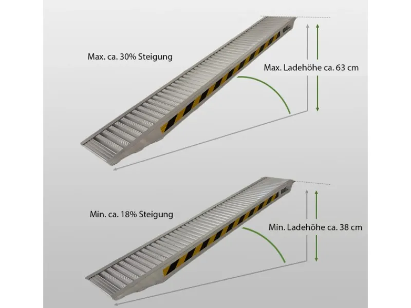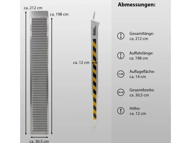 Lieferumfang:1 Stück Alu Auffahrrampe mit SicherungsbolzenBedienungsanleitungTechnische Daten:Gesamtlänge (mit Auflagen)212 cmAuffahrlänge (ohne Auflagen)198 cmLänge Auflage14 cmBreite außen30,5 cmLaufflächenbreite30,5 cmHöhe12 cmLänge | Breite | Höhe (zusammengeklappt)n.a. | n.a. | n.a.min. Auffahrhöhe38 cmmax. Auffahrhöhe63 cmmin Steigung in % | °18% | 10,20°max. Steigung in % | °30% | 16,70°Tragkraft je Stück<1,5m 1.655 kg