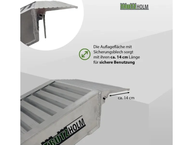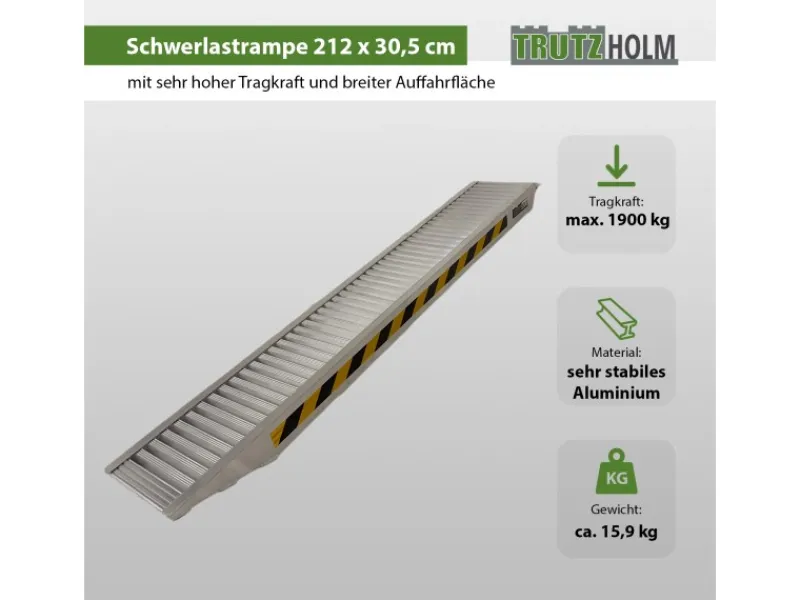 Diese Alu Auffahrrampe ist der perfekte Helfer beim Verladen Ihrer Fahrzeuge.Eigenschaften:sehr stabile Aluminium-Konstruktion – sehr hohe Tragkraft dank 12 cm Höhebis 1.900 kg Tragkraft / Rampe bei gleichmäßiger Verteilung der Last *stark profilierte OberflächeMaße: 212 x 30,5 x 12 cm (LxBxH) – Auffahrlänge: 198 cmein Ende ist abgeschrägt, ein Ende hat eine stabile Auflage mit Anschlagmin. Ladehöhe: 38 cm bei 18% Steigungmax. Ladehöhe: 63 cm bei 30% SteigungLaufflächenbreite: 30,5 cmGewicht: 15,9 kg (je Auffahrrampe)die Anwendungsmöglichkeiten sind vielseitig, im privaten wie auch im gewerblichem Bereich*Belastbarkeit/Stk bei Achsabstand < 1,5m =1.655kg Belastbarkeit/Stk bei Achsabstand > 1,5m =1.900kg