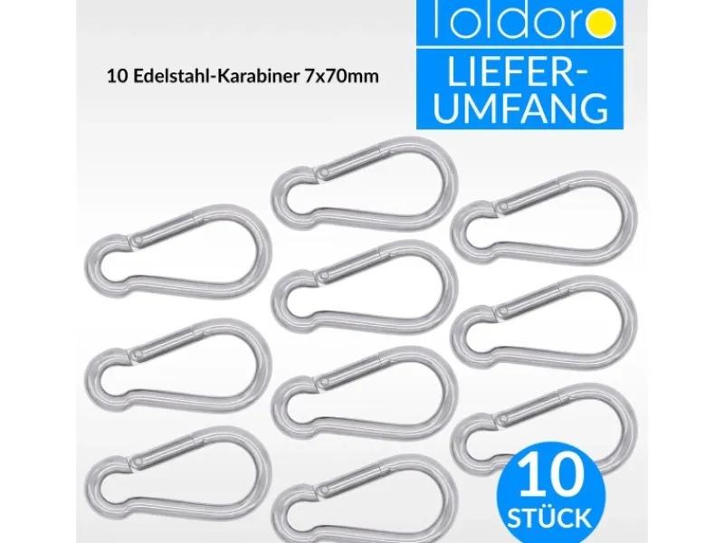 Der praktische Klappmechanismus ermöglicht ein schnelles Öffnen und Schließen ohne Werkzeug. Dadurch eignen sie sich ideal für Verbindungen, etwa zwischen Sonnensegeln und Wandösen. Ihre hohe Zuglast und einfache Handhabung machen sie vielseitig einsetzbar.Warum V4A-Edelstahl?