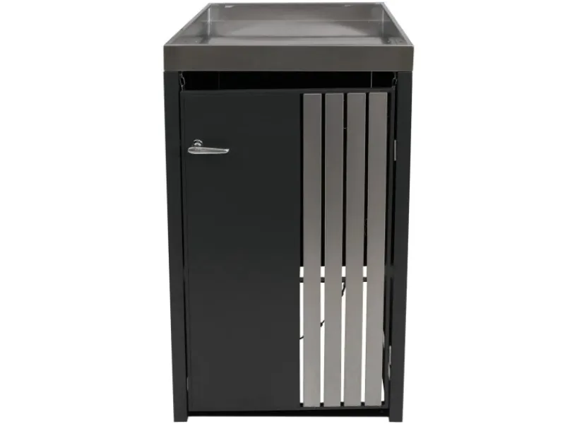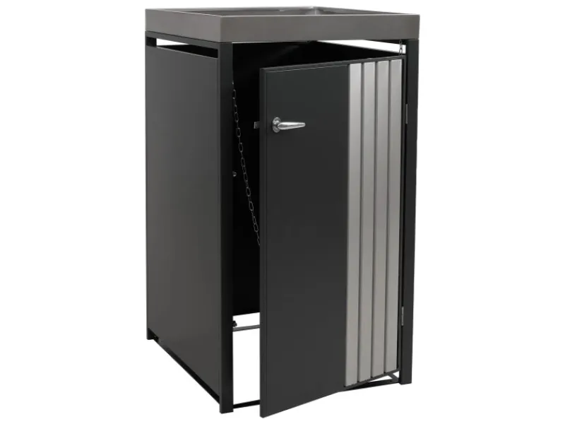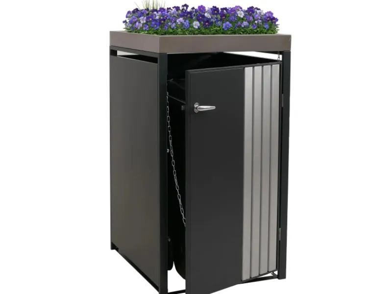 Dank der robusten Bauweise aus verzinktem Stahl überzeugt die Mülltonnenverkleidung durch ihre Wetterbeständigkeit und lange Lebensdauer. Die abschließbaren Türen schützen den Inhalt zuverlässig, während Belüftungsschlitze eine optimale Luftzirkulation gewährleisten. Durch das klare, moderne Design fügt sich die Verkleidung harmonisch in jede Umgebung ein – ob im Garten, an der Hauswand oder in der Einfahrt. Eine praktische und zugleich ästhetische Lösung, um Ordnung und Stil im Außenbereich zu schaffen.