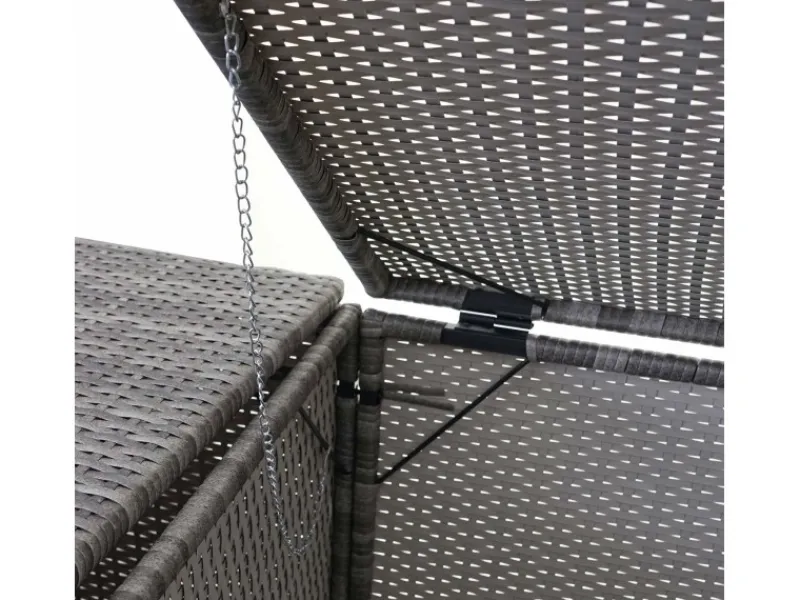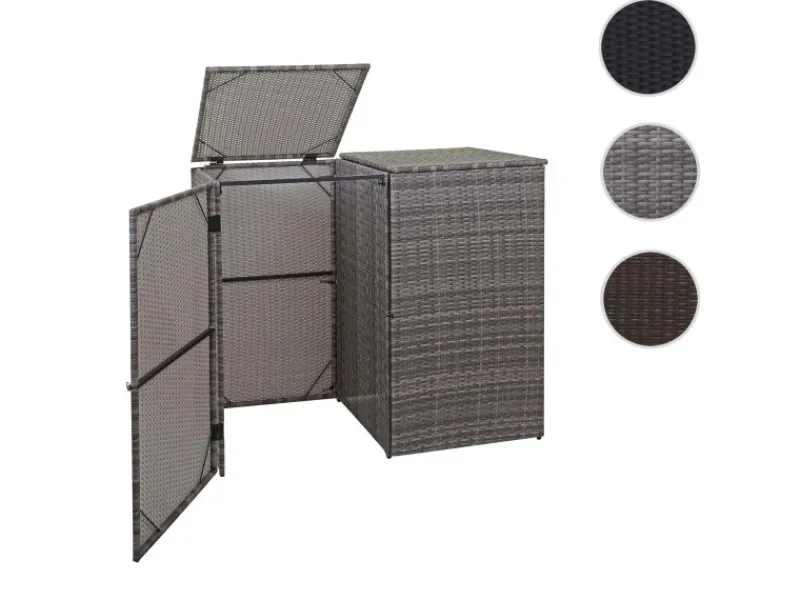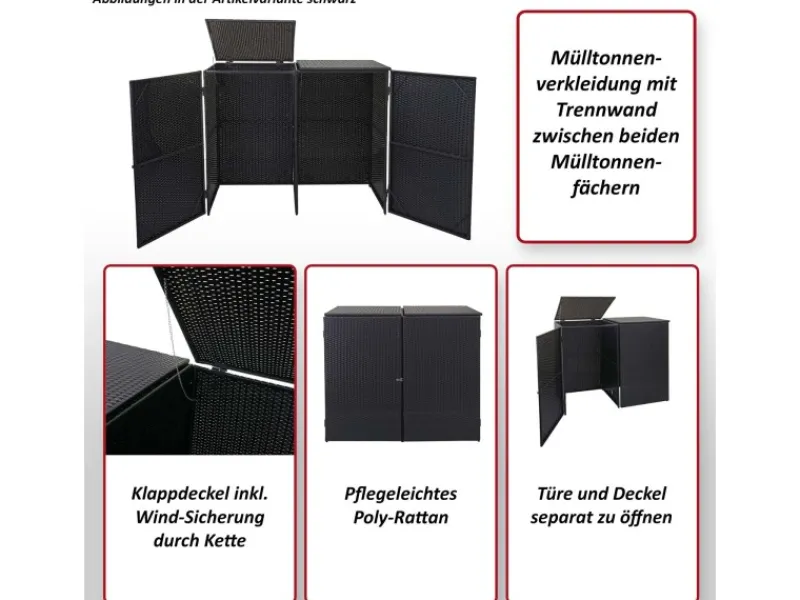 – Diese Mülltonnenverkleidung aus Poly-Ratten ist nicht nur optisch ansprechend. Neben der Tür mit Verschluss ist diese Mülltonnenabdeckung mit zwei praktischen Klappdeckel ausgestattet. Diese erleichtern Ihnen das Befüllen Ihrer Mülltonnen.