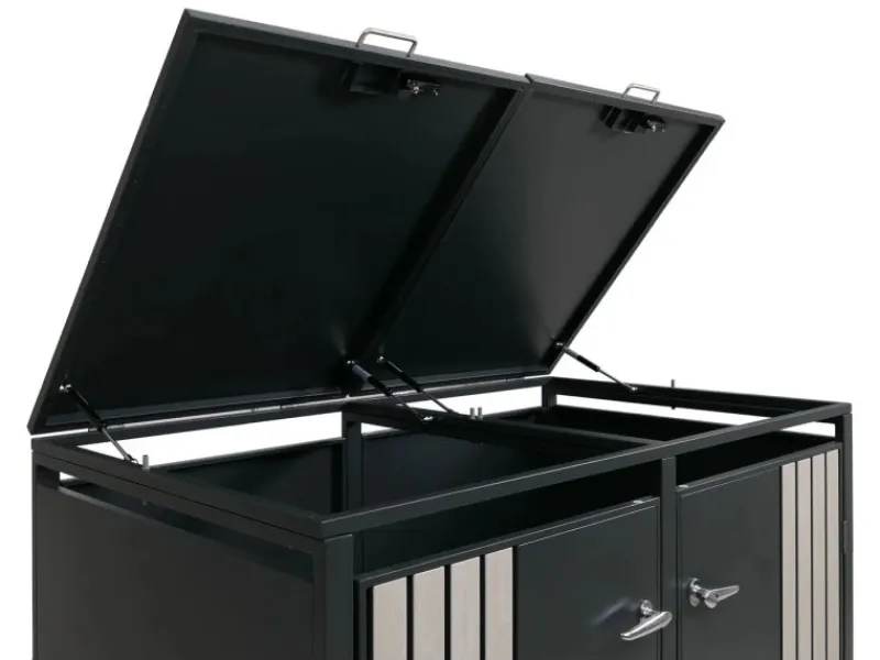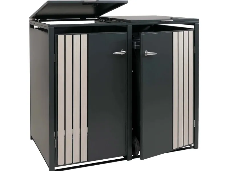 Dank der robusten Bauweise aus verzinktem Stahl überzeugt die Mülltonnenverkleidung durch ihre Wetterbeständigkeit und lange Lebensdauer. Die abschließbaren Türen schützen den Inhalt zuverlässig, während Belüftungsschlitze eine optimale Luftzirkulation gewährleisten. Durch das klare, moderne Design fügt sich die Verkleidung harmonisch in jede Umgebung ein – ob im Garten, an der Hauswand oder in der Einfahrt. Eine praktische und zugleich ästhetische Lösung, um Ordnung und Stil im Außenbereich zu schaffen.