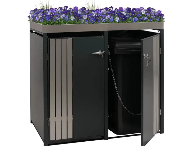Dank der robusten Bauweise aus verzinktem Stahl überzeugt die Mülltonnenverkleidung durch ihre Wetterbeständigkeit und lange Lebensdauer. Die abschließbaren Türen schützen den Inhalt zuverlässig, während Belüftungsschlitze eine optimale Luftzirkulation gewährleisten. Durch das klare, moderne Design fügt sich die Verkleidung harmonisch in jede Umgebung ein – ob im Garten, an der Hauswand oder in der Einfahrt. Eine praktische und zugleich ästhetische Lösung, um Ordnung und Stil im Außenbereich zu schaffen.