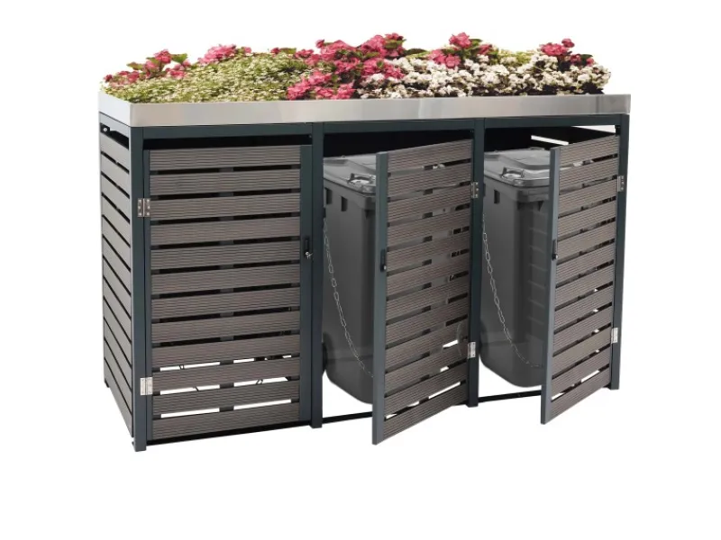 – Diese moderne Mülltonnenverkleidung mit Pflanzkasten ist nicht nur optisch ansprechend. Neben den abschließbaren Türen und dem stabilen Gehäuse, ist der Pflanzkasten mit Ablauflöchern für überflüssiges Wasser ausgestattet.