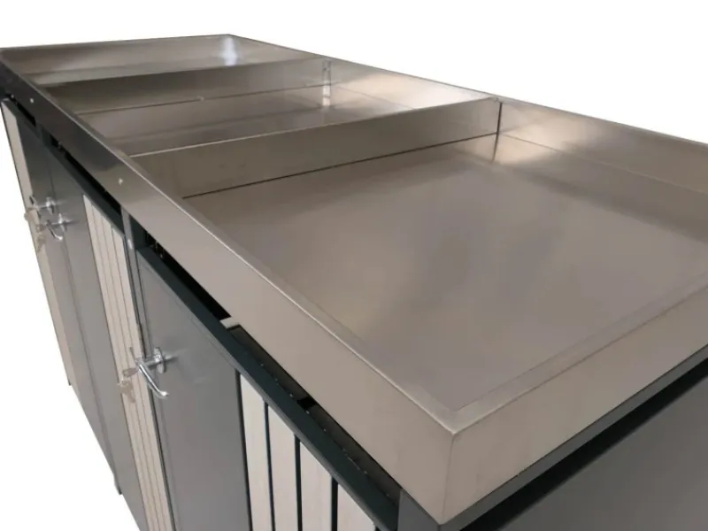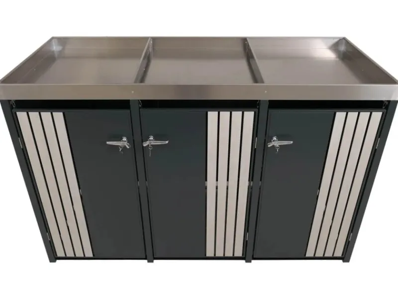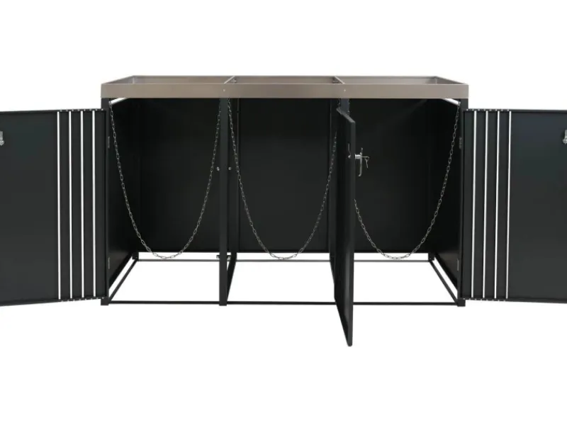 Dank der robusten Bauweise aus verzinktem Stahl überzeugt die Mülltonnenverkleidung durch ihre Wetterbeständigkeit und lange Lebensdauer. Die abschließbaren Türen schützen den Inhalt zuverlässig, während Belüftungsschlitze eine optimale Luftzirkulation gewährleisten. Durch das klare, moderne Design fügt sich die Verkleidung harmonisch in jede Umgebung ein – ob im Garten, an der Hauswand oder in der Einfahrt. Eine praktische und zugleich ästhetische Lösung, um Ordnung und Stil im Außenbereich zu schaffen.