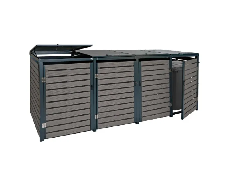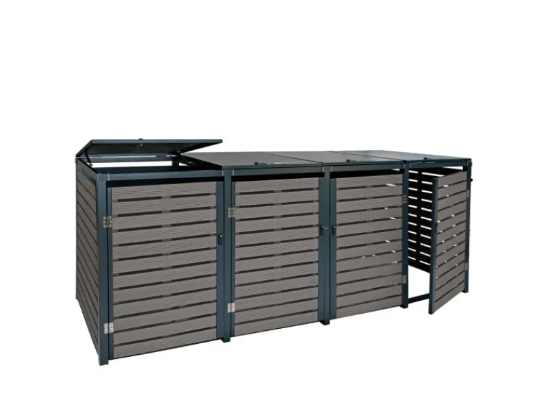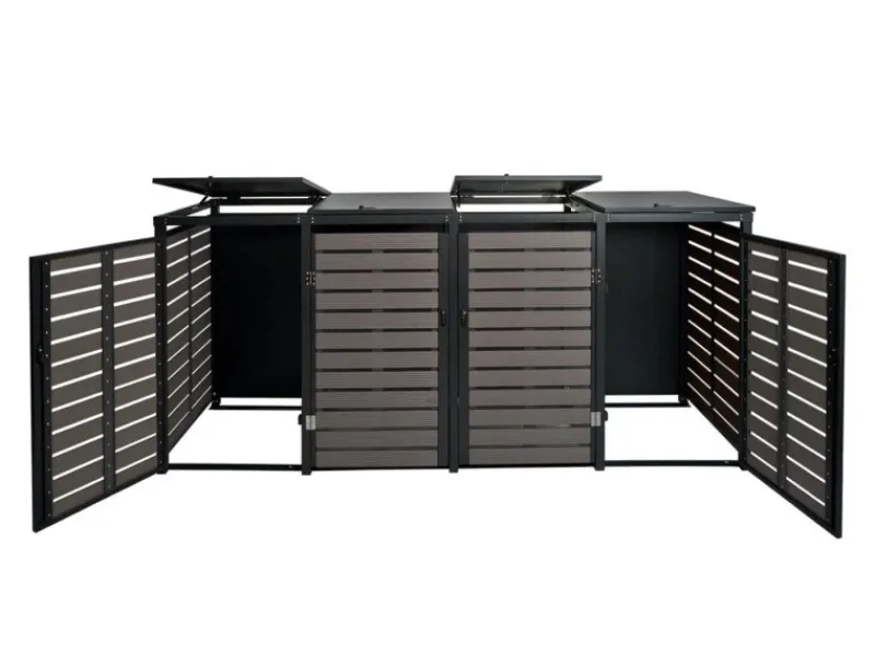 Die Kombination aus WPC-Paneelen und verzinktem Stahlrahmen sorgt für eine besonders langlebige und wartungsarme Konstruktion. Durch das klare, moderne Design fügt sich die Verkleidung harmonisch in jeden Außenbereich ein – ob Garten, Terrasse oder Einfahrt. Der Deckel lässt sich bequem öffnen, während die abschließbaren Türen für Sicherheit und Ordnung sorgen. Dank der Belüftungsschlitze bleibt das Innere stets gut durchlüftet. Eine stabile, pflegeleichte und optisch ansprechende Lösung, um Ihre Mülltonnen elegant zu verbergen und den Außenbereich aufzuwerten.