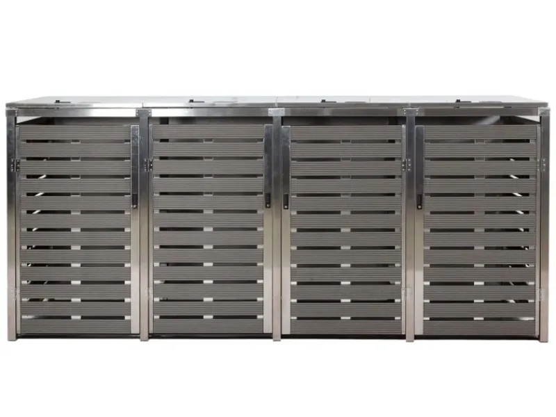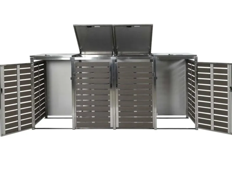 Die Kombination aus WPC-Paneelen und verzinktem Stahlrahmen sorgt für eine besonders langlebige und wartungsarme Konstruktion. Durch das klare, moderne Design fügt sich die Verkleidung harmonisch in jeden Außenbereich ein – ob Garten, Terrasse oder Einfahrt. Der Deckel lässt sich bequem öffnen, während die abschließbaren Türen für Sicherheit und Ordnung sorgen. Dank der Belüftungsschlitze bleibt das Innere stets gut durchlüftet. Eine stabile, pflegeleichte und optisch ansprechende Lösung, um Ihre Mülltonnen elegant zu verbergen und den Außenbereich aufzuwerten.