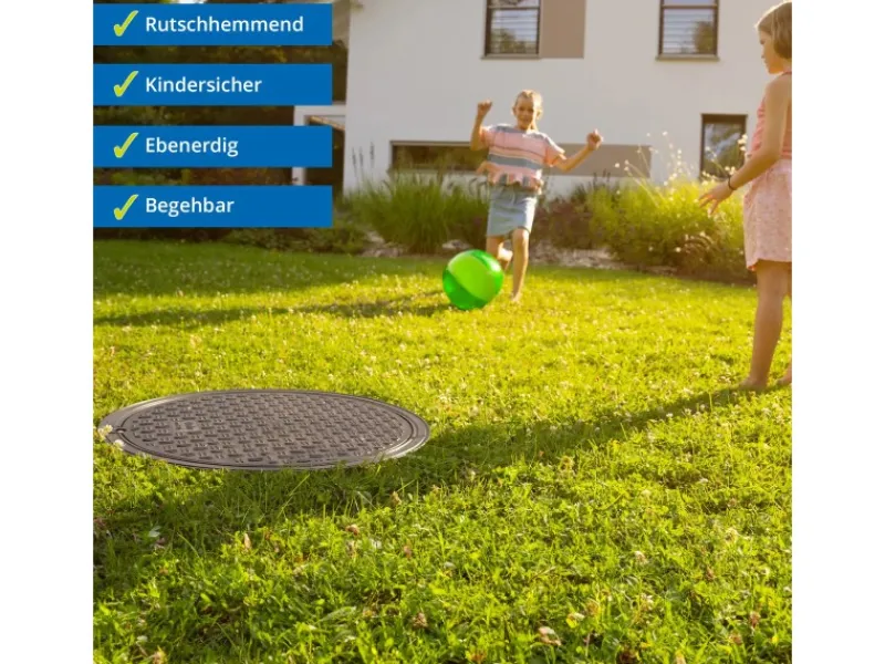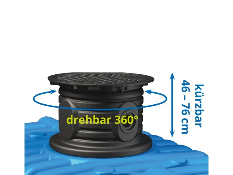 Lieferumfang: FLAT XL Tanksystem mit 1 x Anschlussbohrung inkl. Lippendichtung DN 110, Schachtverlängerung mit 2 x Anschlussbohrungen inkl. Lippendichtung DN 110 (kürzbar von 460 bis 760 mm / 360° drehbar), begehbare Kunststoffabdeckung inkl. Kindersicherung (Farbe schwarz).
